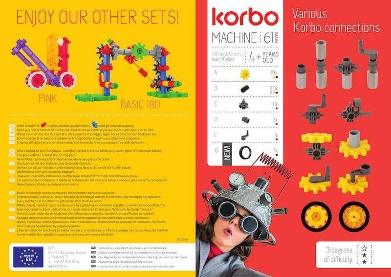 Klocki Korbo создан на основе идеи Think, Build, Spin. Элементом, который отличает Корбо от большинства других конструкторов, является шестерня – деталь, которая заставляет конструкции, построенные ребенком, оживать. Соединение отдельных элементов и создание структур стимулирует ребенка к логическому мышлению, учит терпению и точности, побуждает его преодолевать трудности и искать нестандартные решения. Играя с кубиками, дети младшего возраста учатся распознавать и называть цвета и формы, а также принципы сортировки и классификации. Дизайнеры старшего возраста, в свою очередь, имеют возможность изучить основные принципы механики и физики.