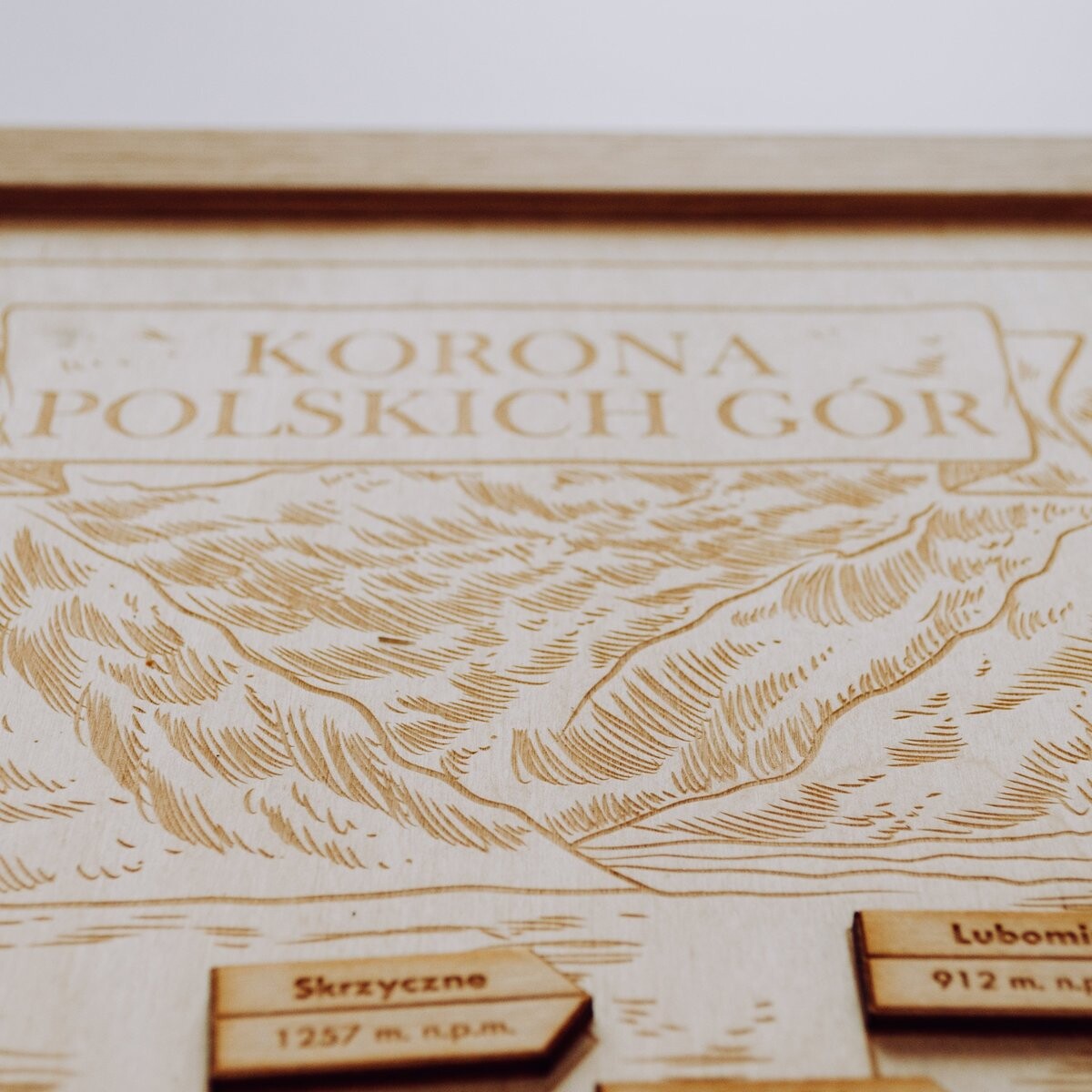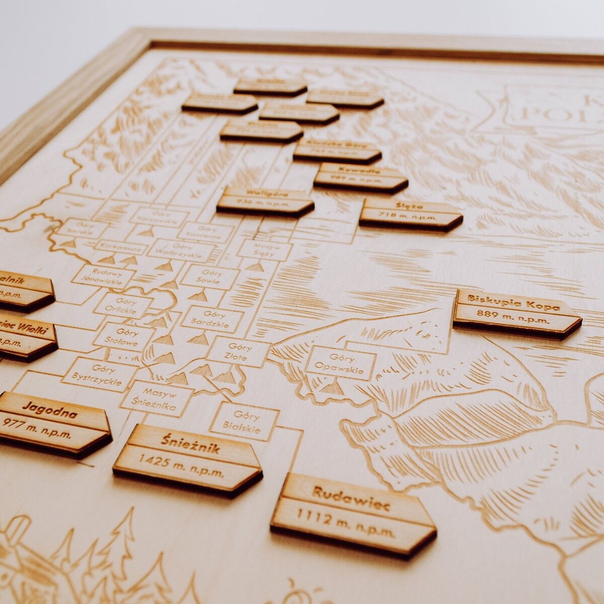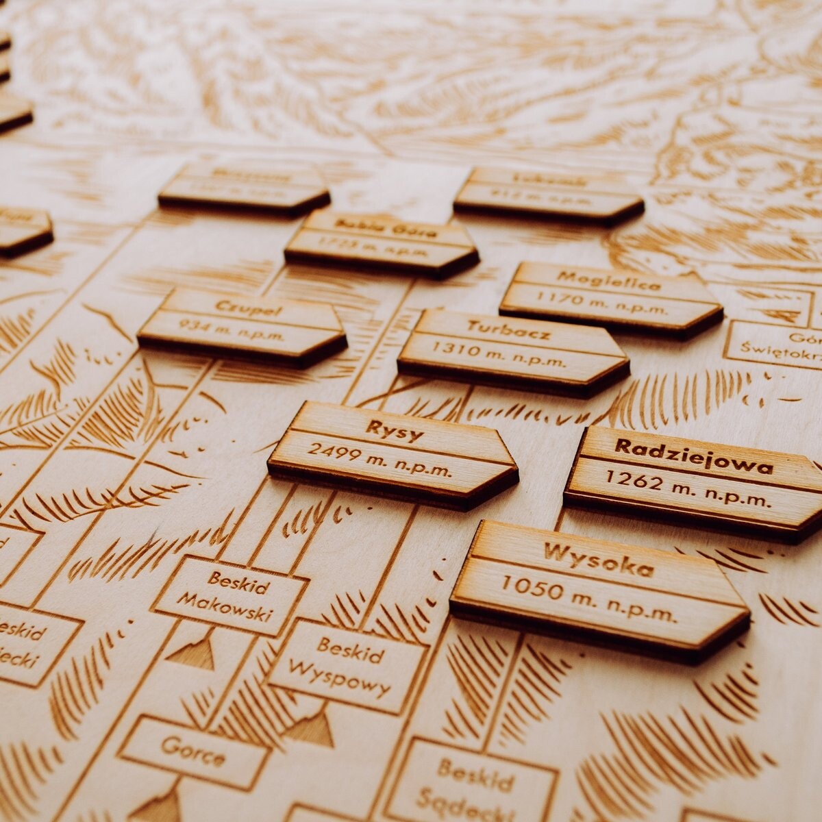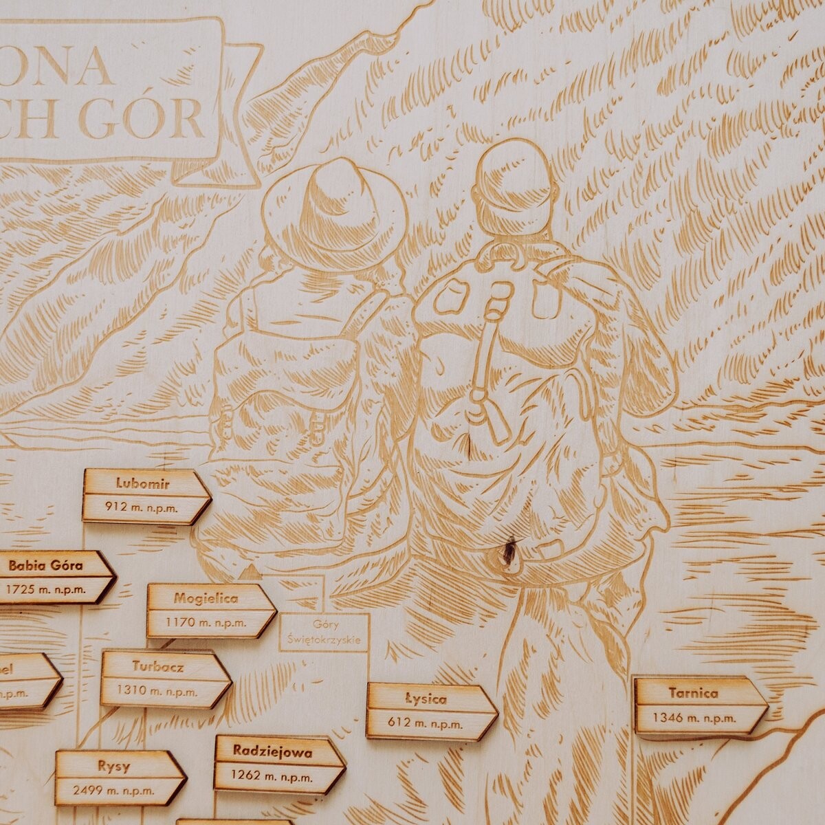Лазерная гравировка, нанесенная на деревянную березовую фанеру, воспламенит сердца и воображение тех, для кого скалолазание является важной частью жизни. Доска включает в себя 28 вершин, расположенных в различных горных массивах Польши. Все это дополняется набором самоклеящихся маркеров для обозначения покоренных вершин. На деревянной картине изображен горный пейзаж, расположенный на юге Польши.