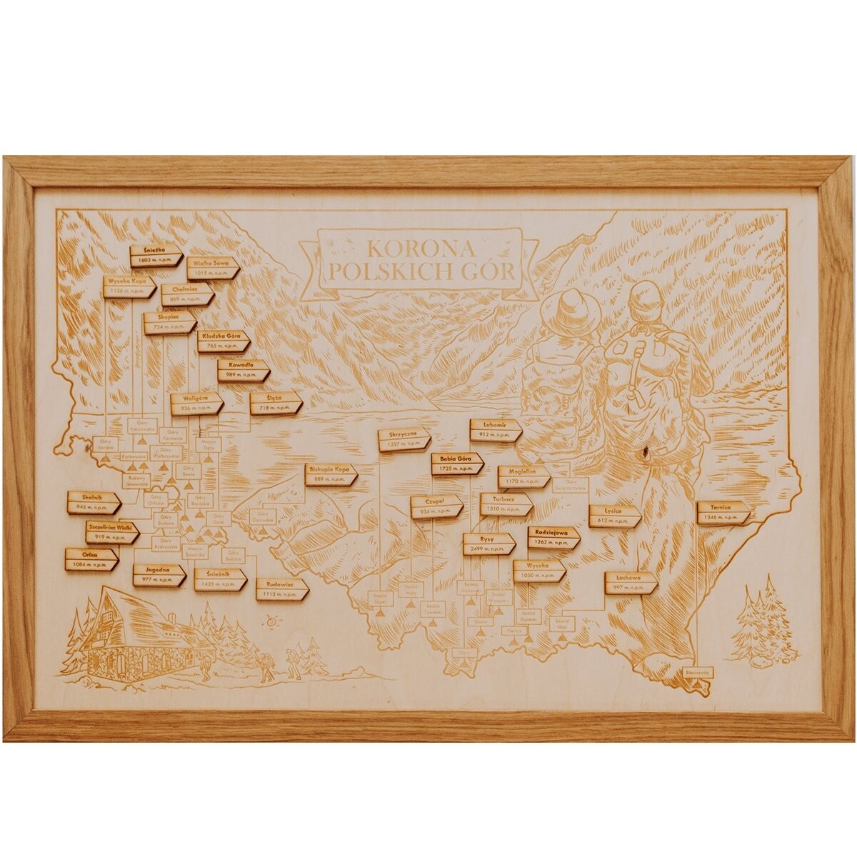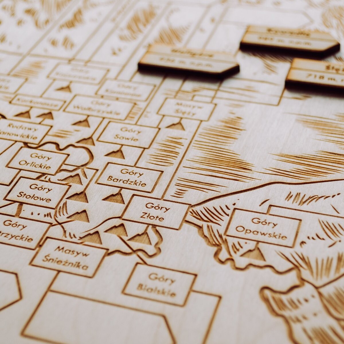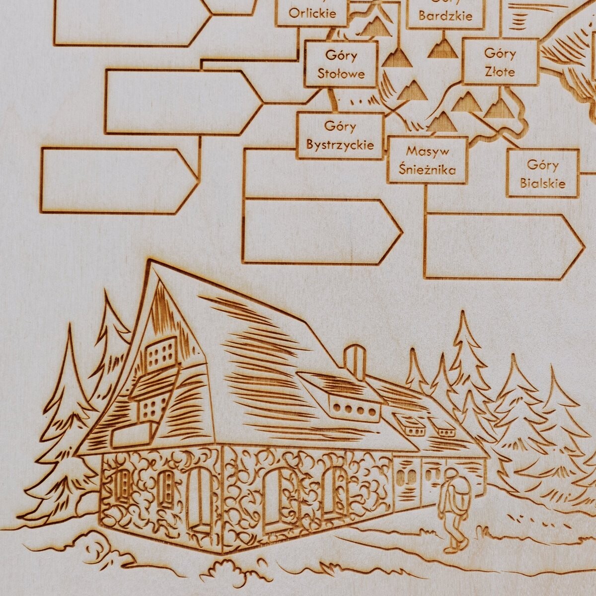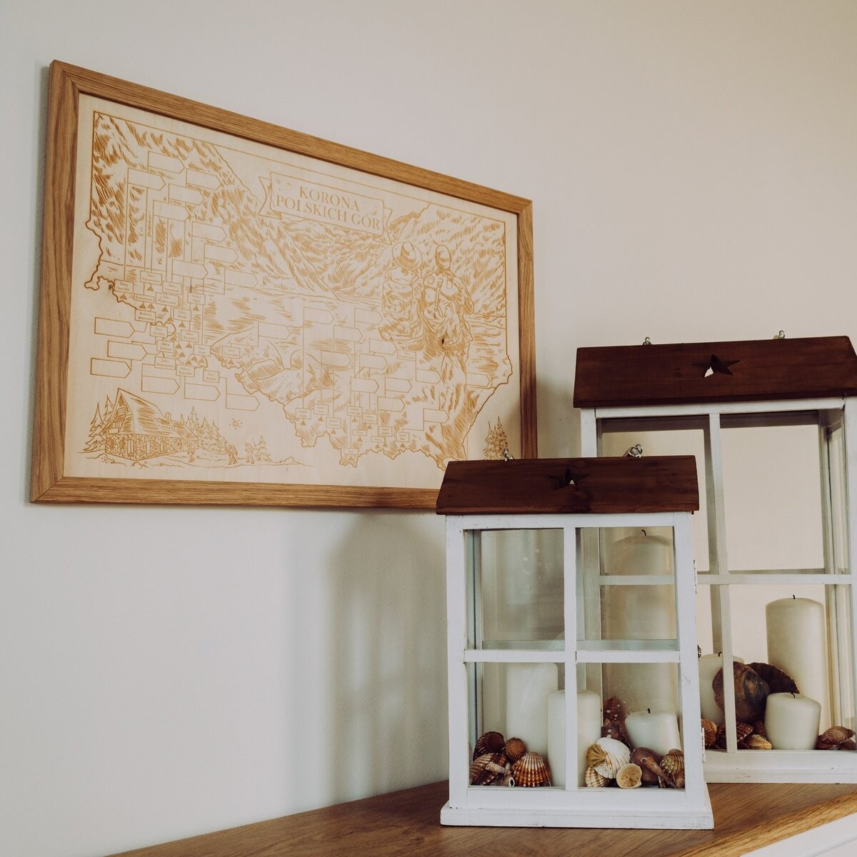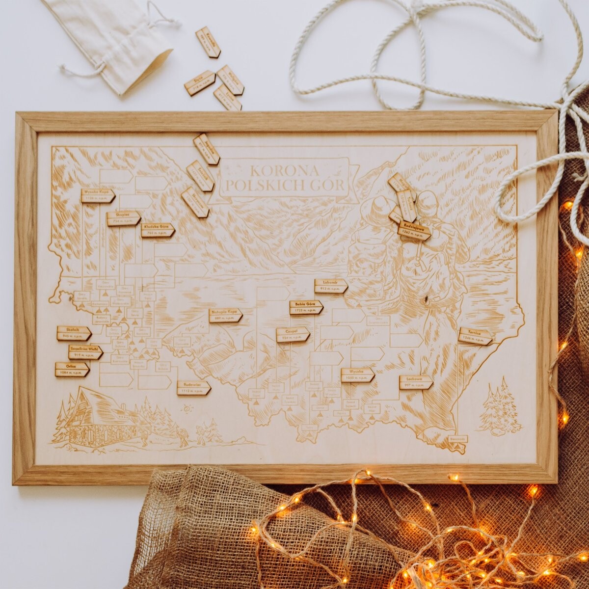 Лазерная гравировка, нанесенная на деревянную березовую фанеру, воспламенит сердца и воображение тех, для кого скалолазание является важной частью жизни. Доска включает в себя 28 вершин, расположенных в различных горных массивах Польши. Все это дополняется набором самоклеящихся маркеров для обозначения покоренных вершин. На деревянной картине изображен горный пейзаж, расположенный на юге Польши.