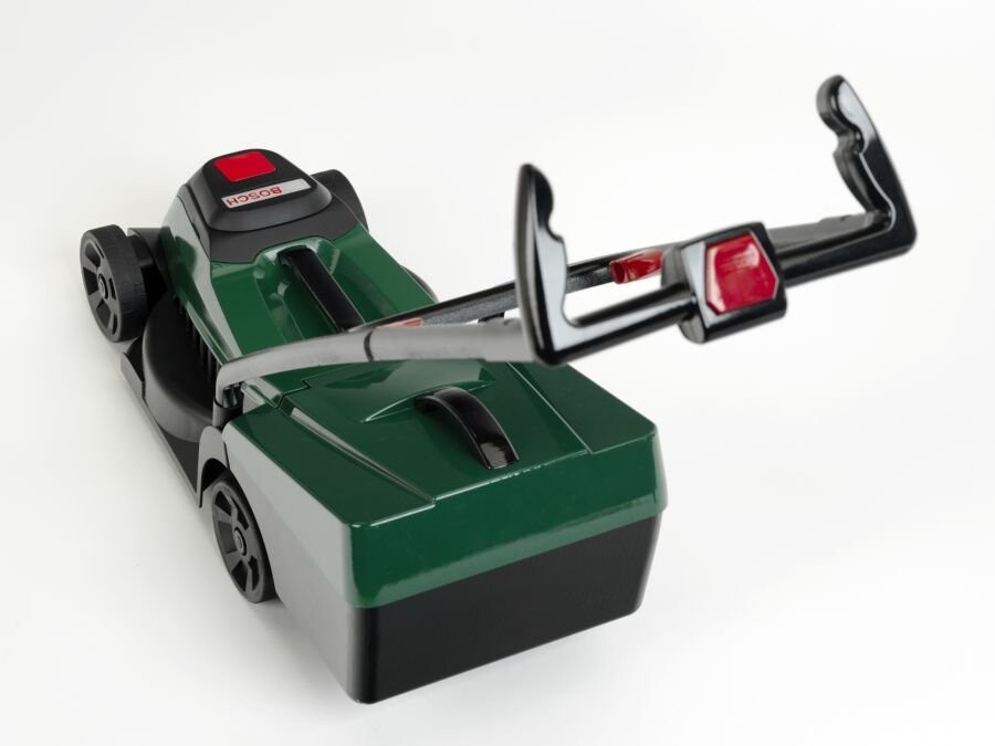 Косилка темно-зеленого цвета с черной ручкой и колесами. Колеса подвижные, поэтому газонокосилка может передвигаться по различным поверхностям. Отличительным элементом данного оборудования является съемный световой и звуковой модуль, размещенный на передней части игрушки, где после нажатия кнопки в модуле загорается логотип Bosch, а также он начинает издавать очень реалистичные звуки работы двигателя и травы. кошение. Модуль работает от аккумулятора и совместим с другими игрушками серии Bosch (дрель и отвертка KL8567 и шарнирная лампа KL 8448).