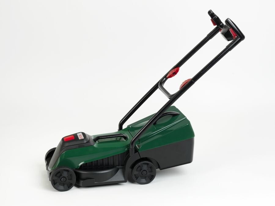 Внутри газонокосилки пусто, что делает ее достаточно легкой, чтобы с ней могли играть дети. а для возможной переноски сверху корпуса имеется специальная ручка. Еще одной важной особенностью этой газонокосилки является съемный контейнер для мусора. Популярная садовая игрушка оснащена имитацией электростартера, размещенной на ручке газонокосилки. Несмотря на имеющийся световой и звуковой модуль, косилка при перекатывании издает механические дребезжащие звуки, а также радостно тарахтят колеса при движении. Черная ручка в виде рукоятки для направления косилки имеет длину около 45 см, что дает садовому инвентарю около 55 см в высоту и 22 см в ширину соответственно, готовый к игре. Газонокосилка наверняка понравится всем детям, которые любят играть в садоводство. Благодаря высокому качеству изготовления набор прослужит долго.