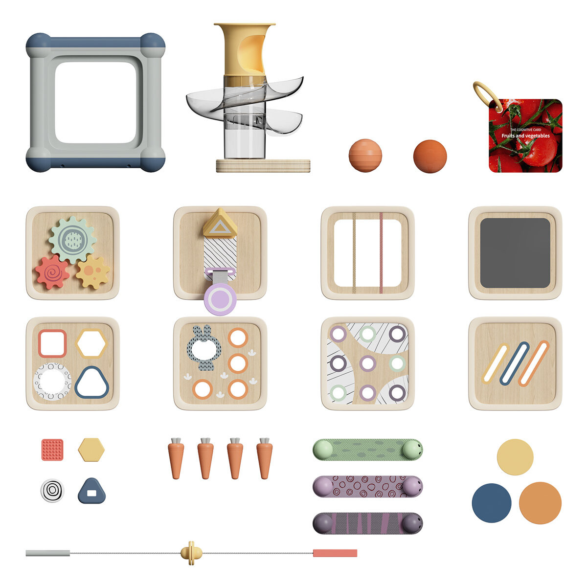 Множество различных игровых возможностей. Как логические, так и двигательные задачи (например, горка с шариками или зеркалом, игра с нитками, сортировка моркови или фигурок, приклеивание червячков, вставка монет). вращая колеса, натягивая веревку или проталкивая различные фигуры и шарики через резинки).