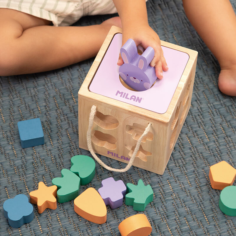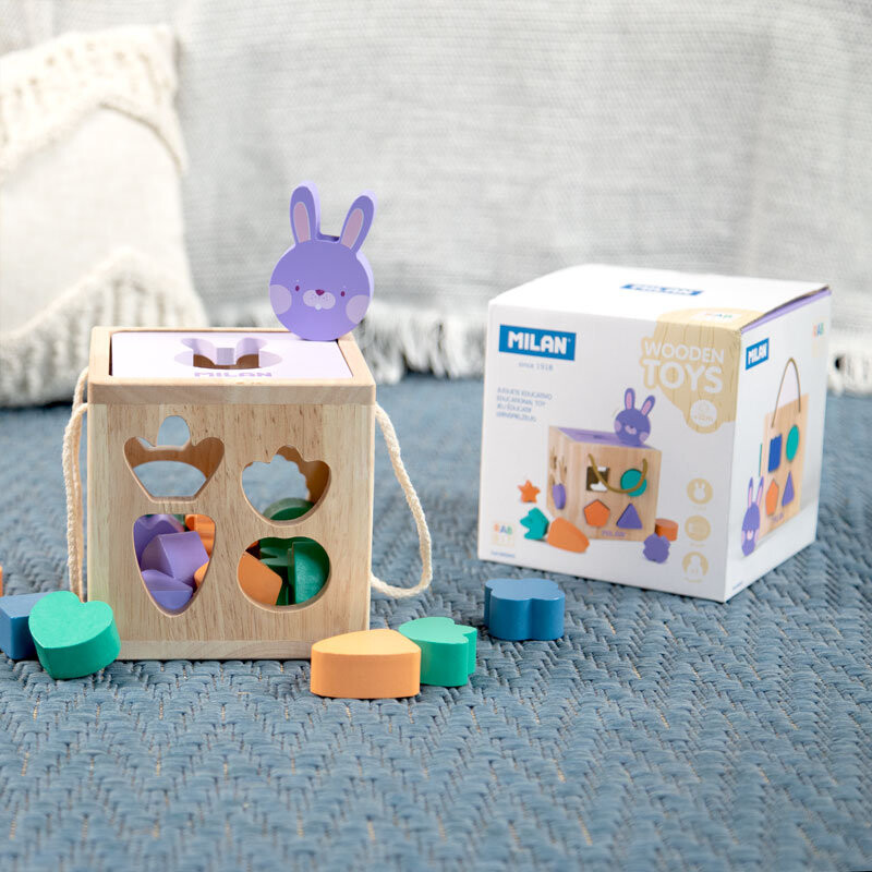 Деревянная развивающая игрушка «Кролик» с 17 геометрическими, закругленными элементами и кубиком с одинаковыми отверстиями и крышкой для легкого снятия элементов. Способствует развитию мелкой моторики, логики и зрительно-моторной координации. Рекомендуется с 12 месяцев.