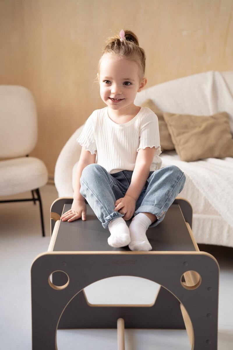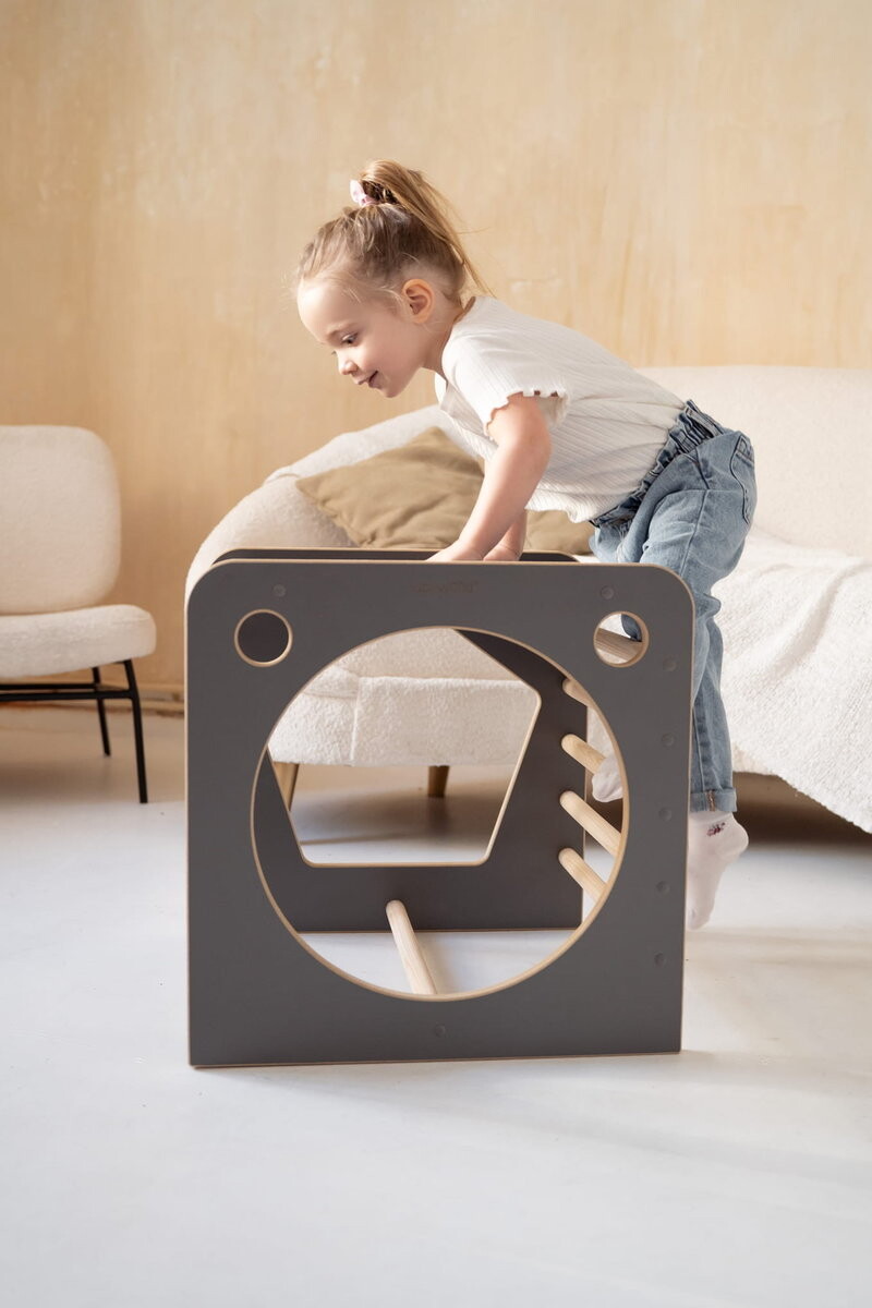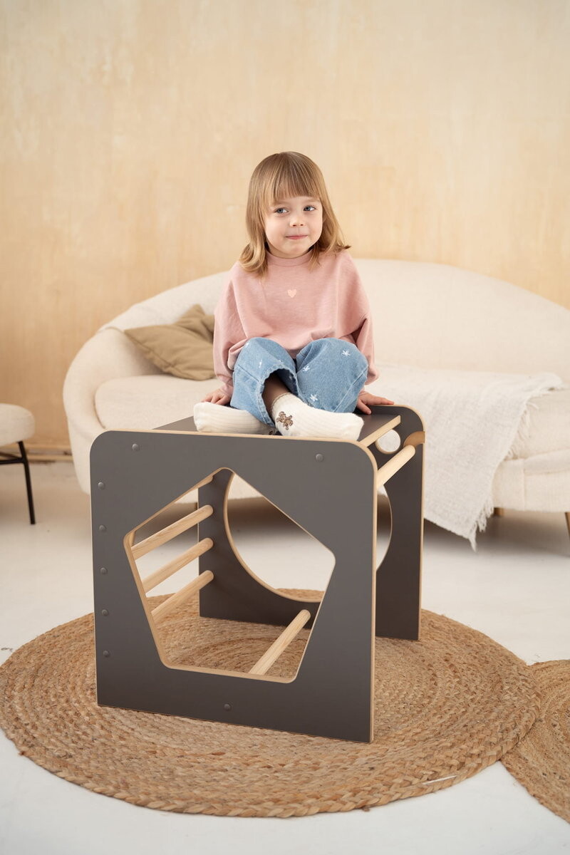 С одной стороны, CUBE имеет ступеньки, по которым можно подниматься и тренировать координацию движений. По бокам есть отверстия с фигурками, которые можно использовать для обучения и игры – то есть перемещения между ними. А на самом верху расположена столешница, предназначенная для рисования, живописи и других художественных занятий.