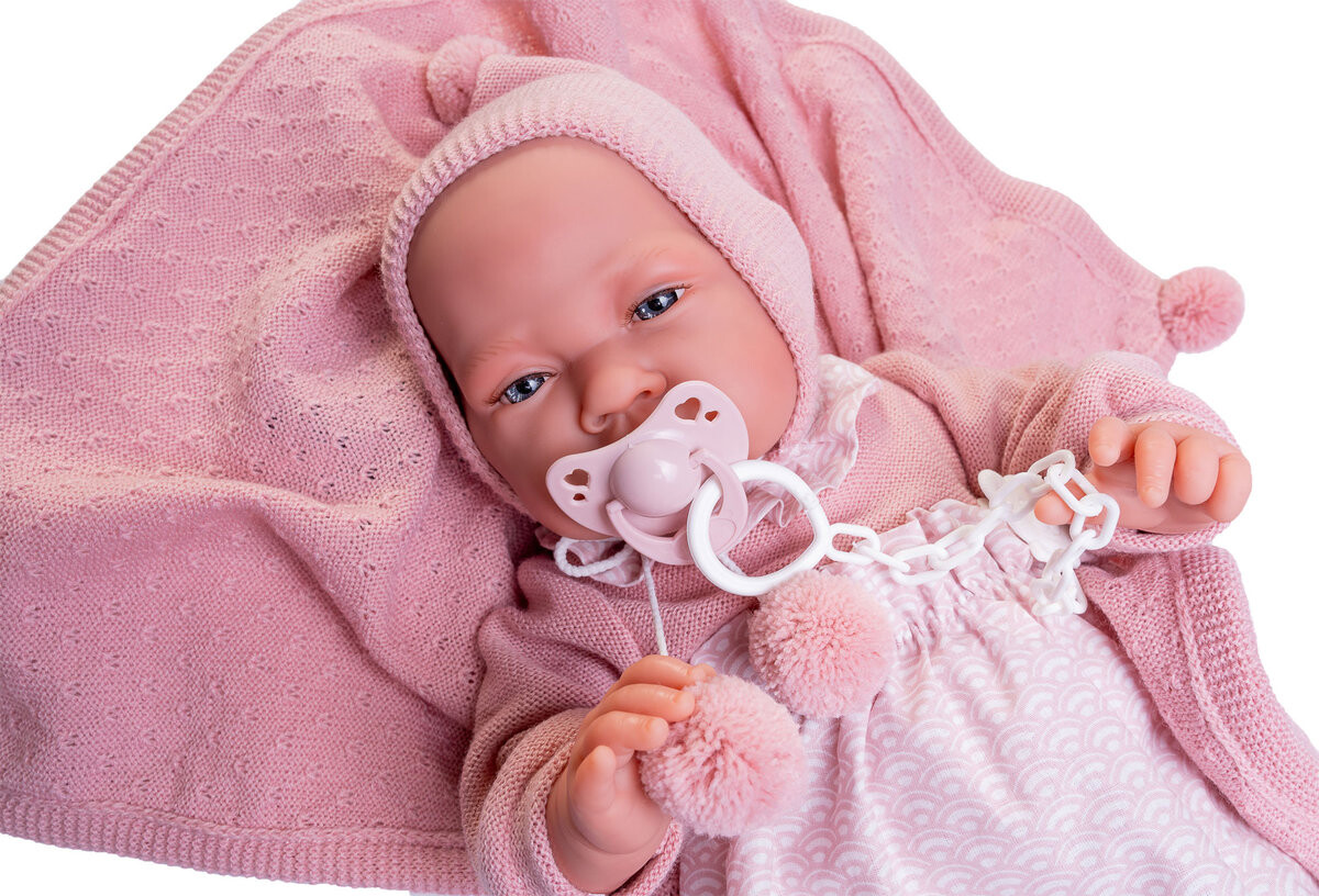Эта очаровательная кукла одета в элегантную длинную юбку. Ей нравится закутываться в плед с помпонами, который идеально сочетается с ее шляпкой. Когда она устанет, просто положите ей в рот соску, чтобы расслабить ее. Ее мягкое тело делает ее идеальной для объятий а голова и конечности сделаны из нежного винила.