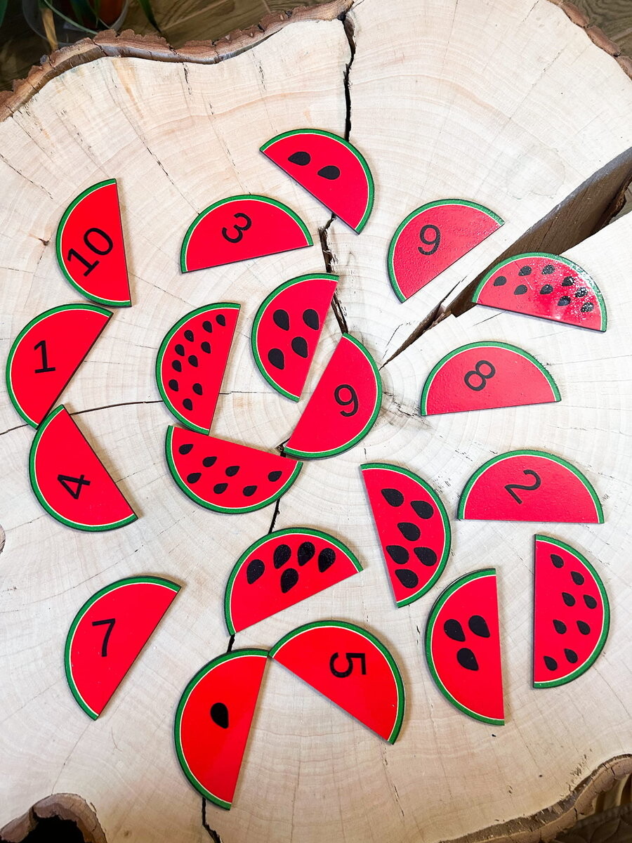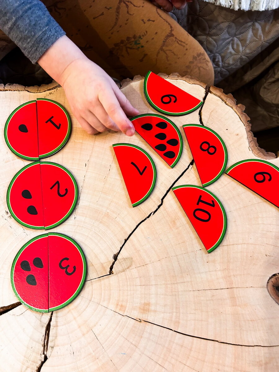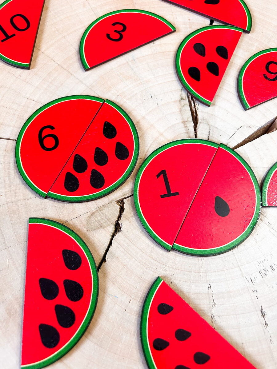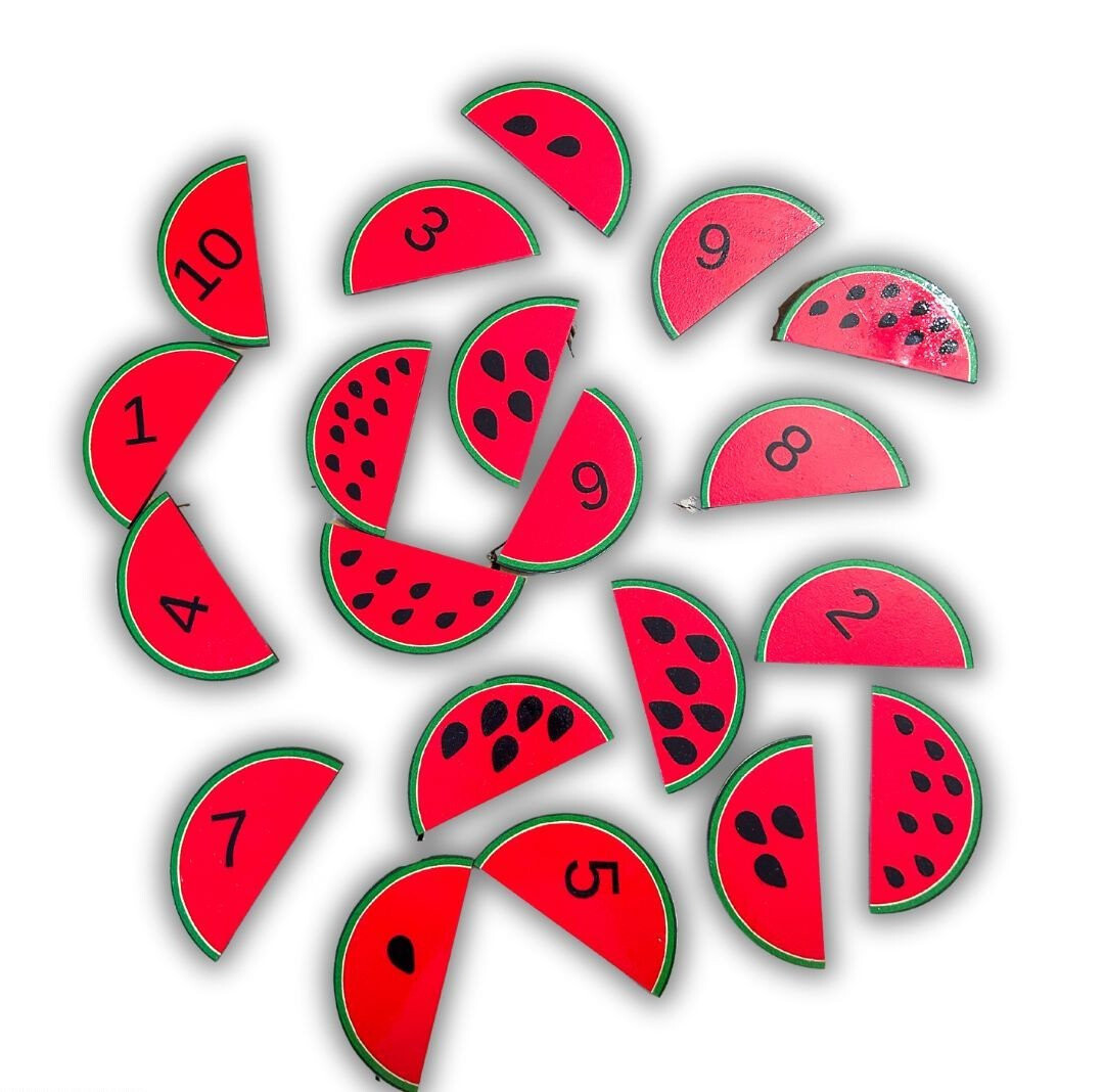 Откройте для себя прелести математики с помощью нашей красочной головоломки с арбузом! Эта сочная развивающая игра — идеальный способ познакомить детей дошкольного и школьного возраста с миром чисел и основных арифметических операций. В наборе 20 деревянных половинок арбуза, которые визуально обозначают цифры от 1 до 10 и соответствующее количество семян. Вашему ребенку понравится сопоставлять каждую половину числа с его семенным аналогом, одновременно развивая зрительно-моторную координацию и навыки счета.