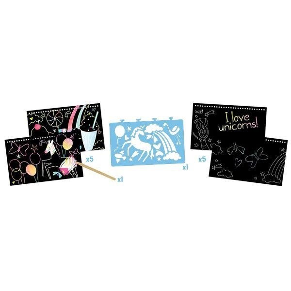 Скретч-игра «Земля фантазий» со стилусом содержит 10 карточек с замечательными иллюстрациями, которые ждут своего открытия. Используя деревянное перо, вы можете рисовать на них, соскребая слой черной краски, и открывать для себя красочный мир русалок, бабочек, единорогов, радуги и многих других. Прилагаемый лист трафарета можно снять, поместить на любую карту и выцарапать фигуры единорогов, радуги, фламинго и многого другого!