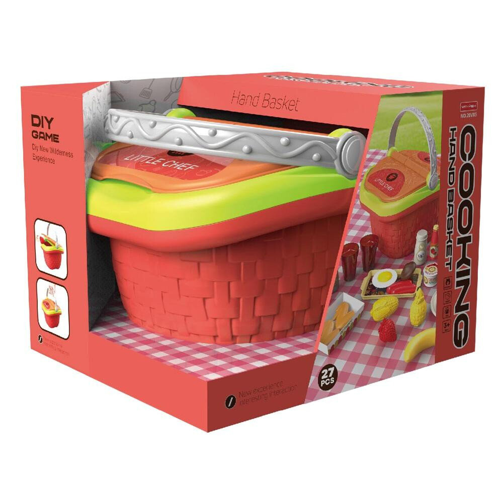 Корзина для пикника с аксессуарами. В комплект входит корзина, пластиковые бутылки с фруктами, овощами, мясом, специями, гриль, кастрюля и наклейки. Всего 27 штук.