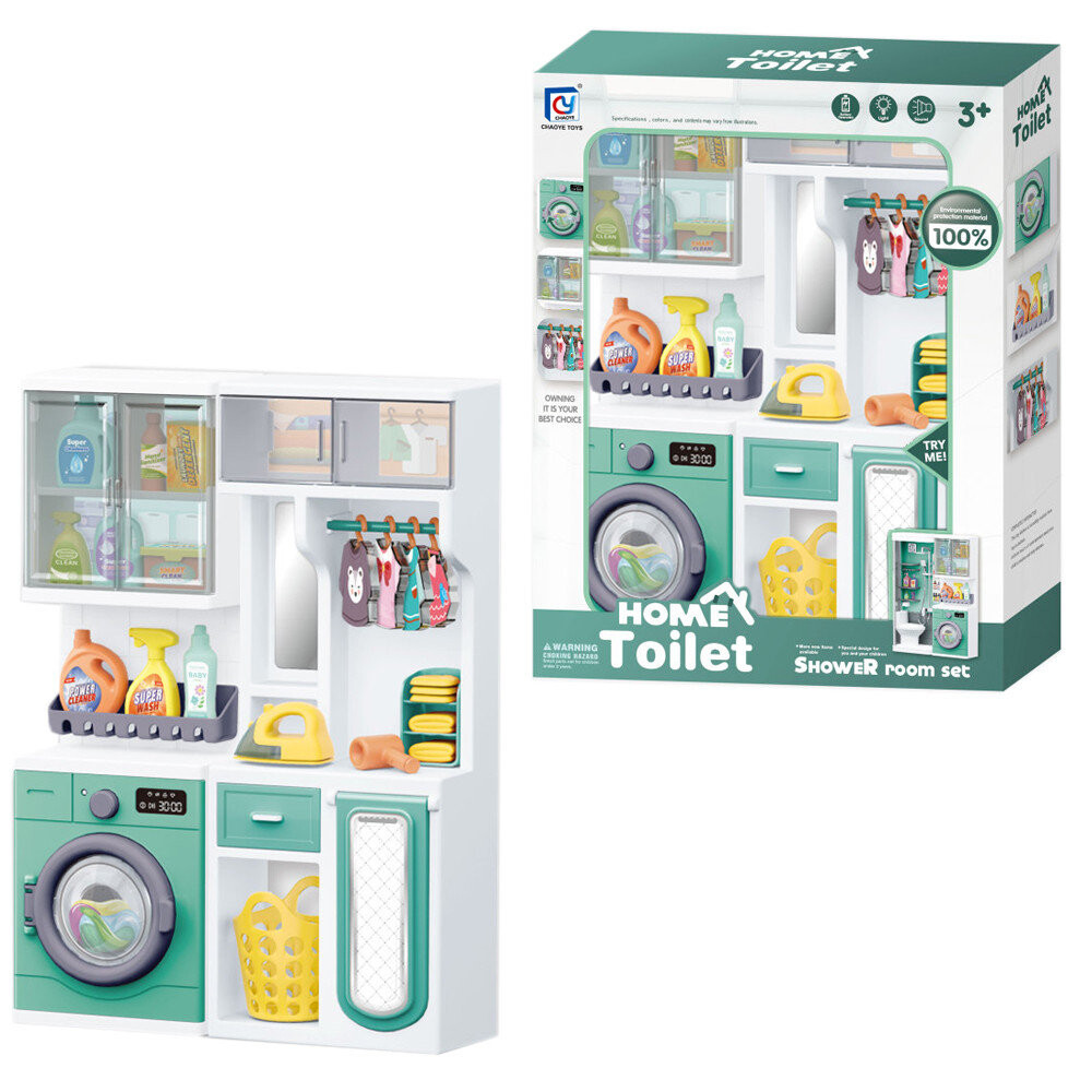Комплект мебели для ванной комнаты - состоит из элемента со стиральной машиной на аккумуляторе, имеющей (звук и свет). В комплект также входят: гладильная доска, утюг, корзина для белья и верхние шкафчики.