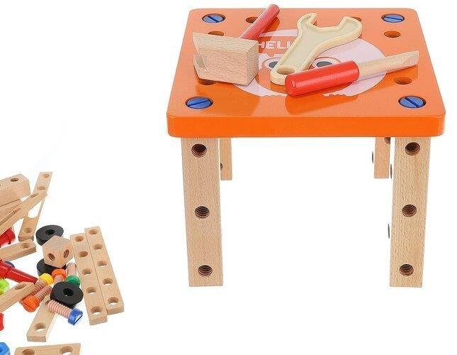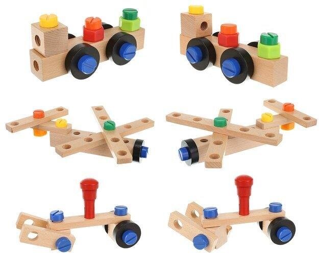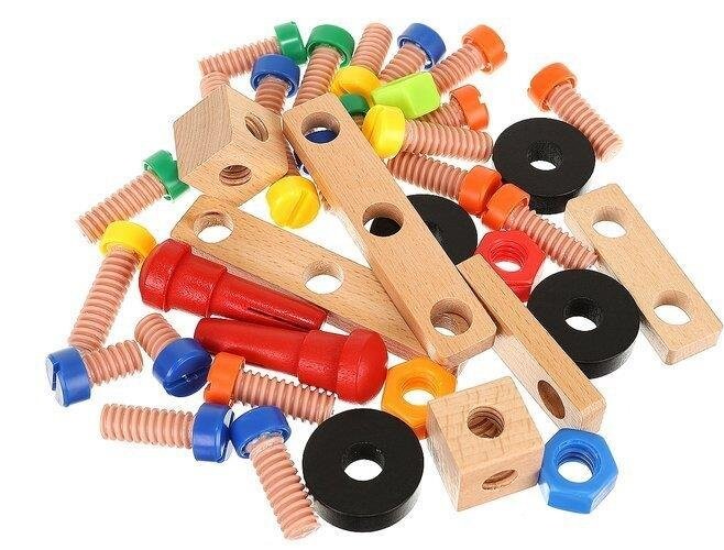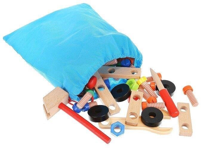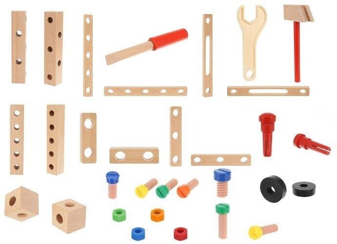 ДОЛГОВЕЧНОСТЬ И ПРОЧНОСТЬ – деревянные элементы не портятся быстро и могут использоваться многократно. Им не страшны никакие забавы – они останутся целыми даже после многочасового удара молотком. Прочный комплект также обеспечивает безопасность ребенка – можно не бояться, что поврежденный элемент застрянет в ручке.