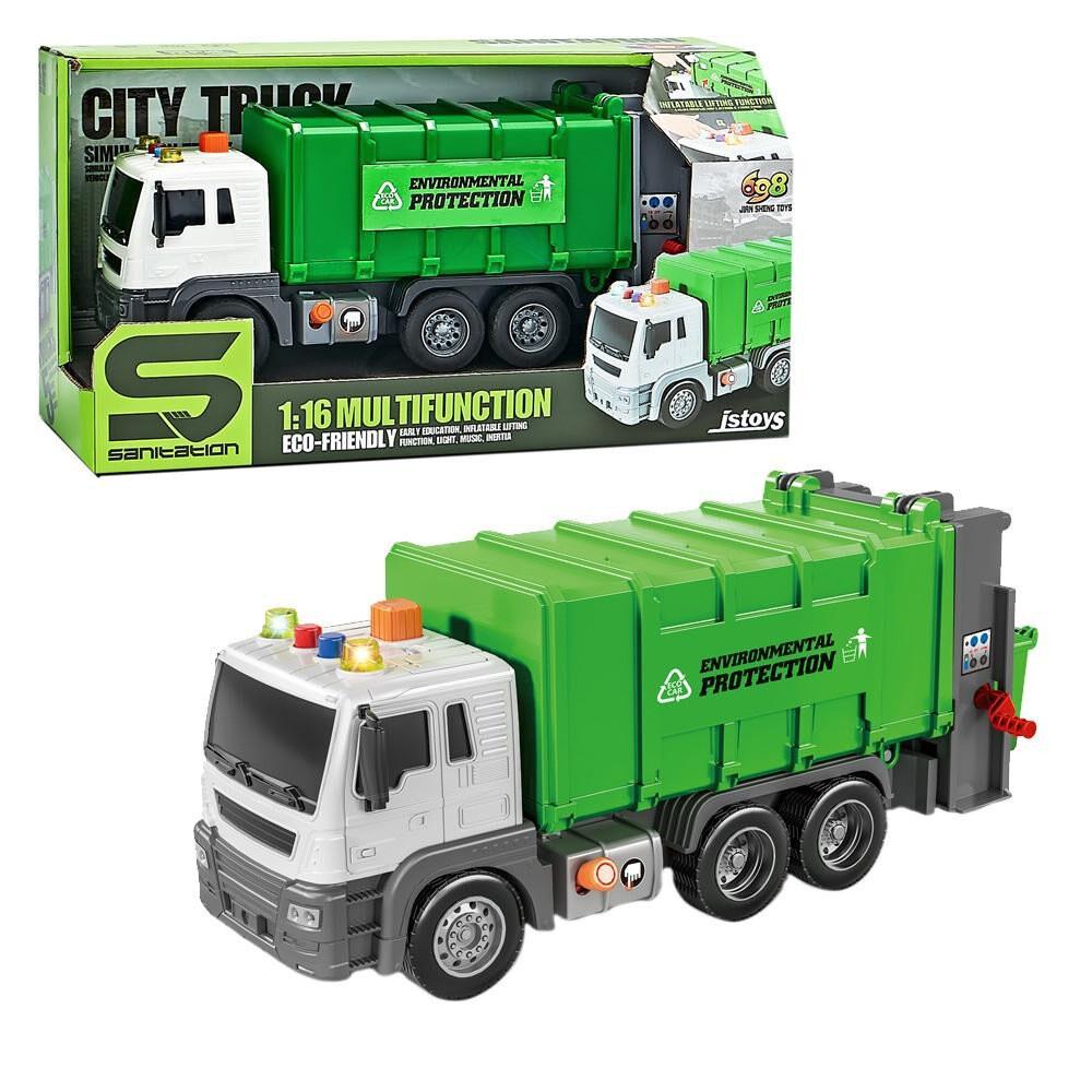Мусоровоз с мусорными баками с подвижными элементами – корзины размещаются на кузове мусоровоза и поднимаются вверх. Машинка имеет звуковые и световые эффекты.