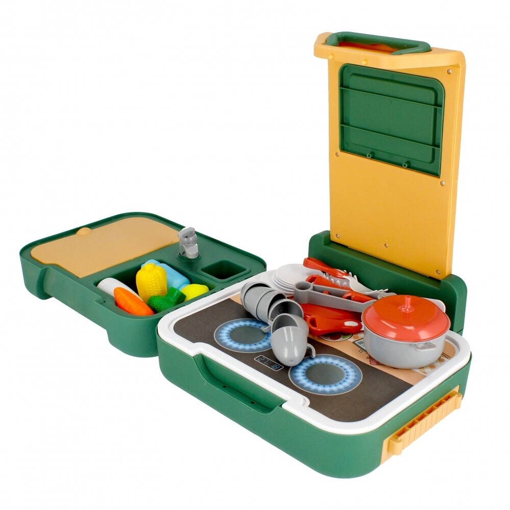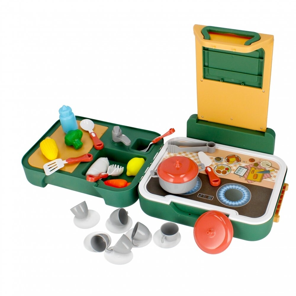 Преимущества продукта: Кухня 3 в 1 развивает творческие способности ребенка, помогает ему учиться и усваивать обязанности, тренируя кулинарные навыки. Возможно, ваш ребенок в будущем станет следующим Мастершефом? Для начала лучшим решением будет потренировать его навыки на МЕГА-КРЕАТИВНОЙ кухне. Приятного времяпрепровождения на кухне. Станьте хозяином собственного шеф-повара и приготовьте что-нибудь вкусненькое для своих гостей. Все необходимые для этого аксессуары можно упаковать. удобный чемодан, который вам не составит труда брать с собой повсюду, игрушка подойдет для игры как дома, так и во дворе. Целых 41 аксессуар, на кухне также есть раковина, где можно мыть посуду или продукты перед приготовлением еды, а также небольшой выдвижной ящик. Содержание набора: . Ручная кладь, плита-имитация плиты с двумя конфорками, кастрюля с 2 крышками, 6 тарелок. 6 чашек, яичница, нож, ложка, щипцы, лопатка для макарон, 2 лопаточка, 2 бутылки с соусами, овощи и фрукты: лимон, кукуруза, морковь, брокколи, - все продукты являются имитацией настоящих. Все сделано из пластика и картона. Размеры/вес/батарейки: размеры изделия длина х высота х глубина см: кухня в разложенном виде 52х31х22 - кухня в сложенном виде, чемодан 26х22х11, размеры упаковки: длина х высота х глубина см: 28x22x11, вес изделия без упаковки кг: 0,88 кг, вес изделия с упаковкой кг: 0,92 кг, батарейки не требуются. Предназначен для детей от 3 лет. Упаковано в удобный пластиковый чемоданчик с ремешком. Упаковка в коробке по 16/32 шт.