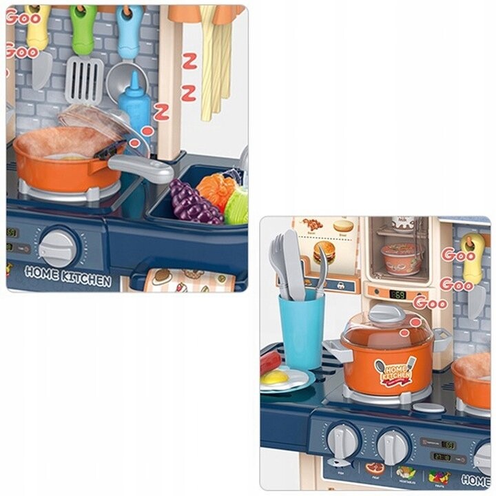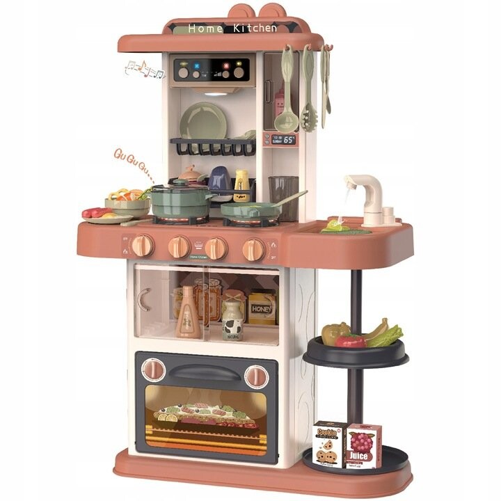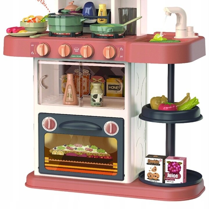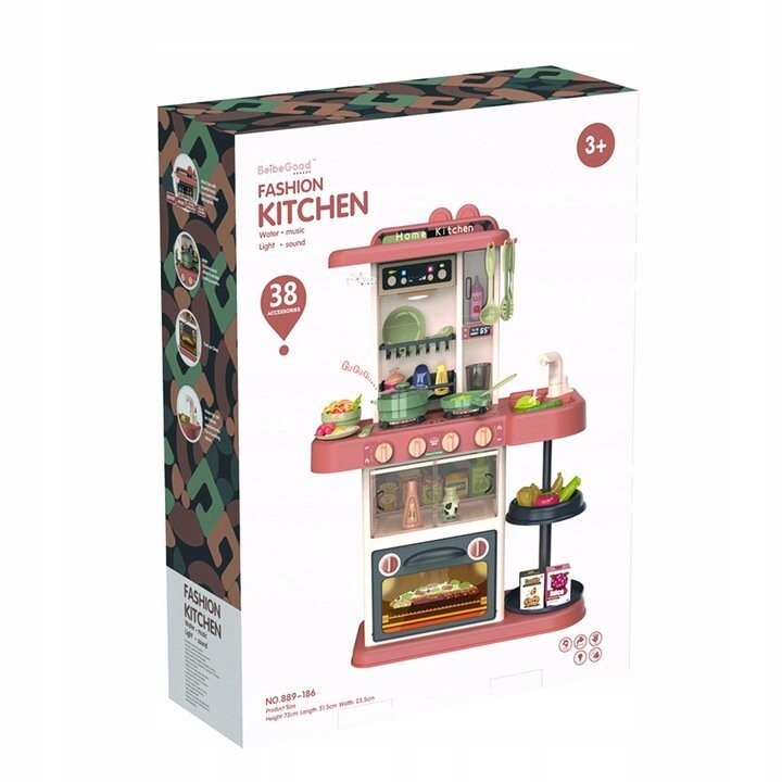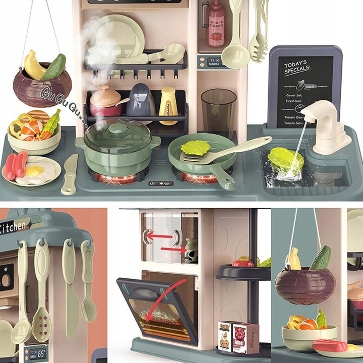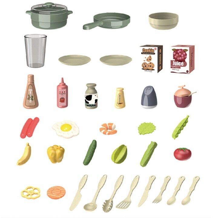В набор входит 38 аксессуаров (фрукты, овощи, кастрюли, тарелки, столовые приборы, продукты питания)Функции кухни