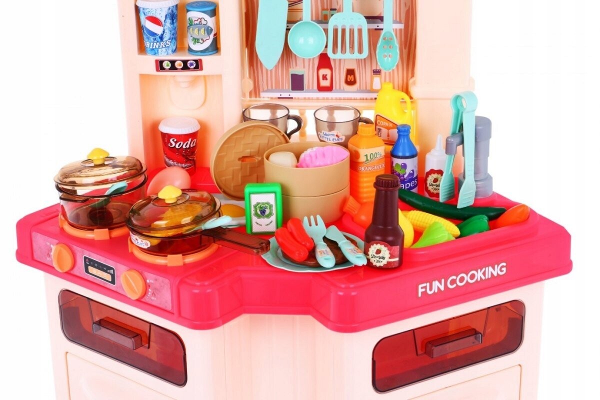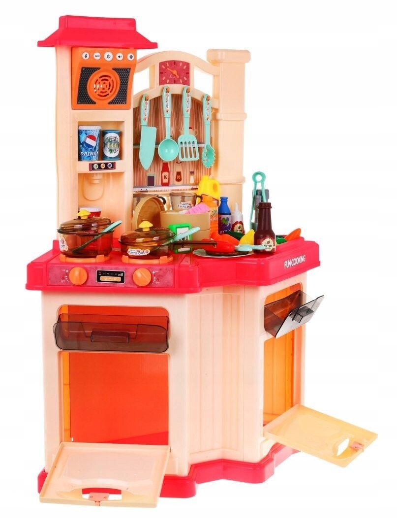 Кухня – любимая игрушка каждой девочки и многих мальчиков, эта, выполненная в розовых тонах, особенно понравится маленьким хозяйкам. Кухня предназначена для детей старше трех лет. Он имеет звуковые и световые эффекты, а также кран, из которого льется вода, и одну горелку, производящую пар. Кухня также оборудована часами с движущимися стрелками, вентилятором со звуком и играющим радио. Комплект питается от 6 батареек типа АА, которые не входят в комплект поставки.