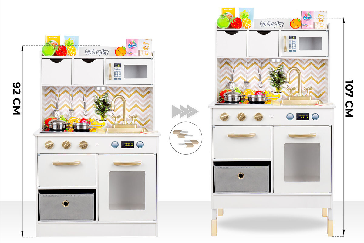 Кухня имеет два уровня высоты: 92 см и 107 см. Эту уникальную кухню можно поднять на ножках. благодаря чему кухня «растет» вместе с ребенком. Высота от земли до столешницы 49 и 64 см соответственно – это действительно много.Порядок важен – съемные ящики и корзина