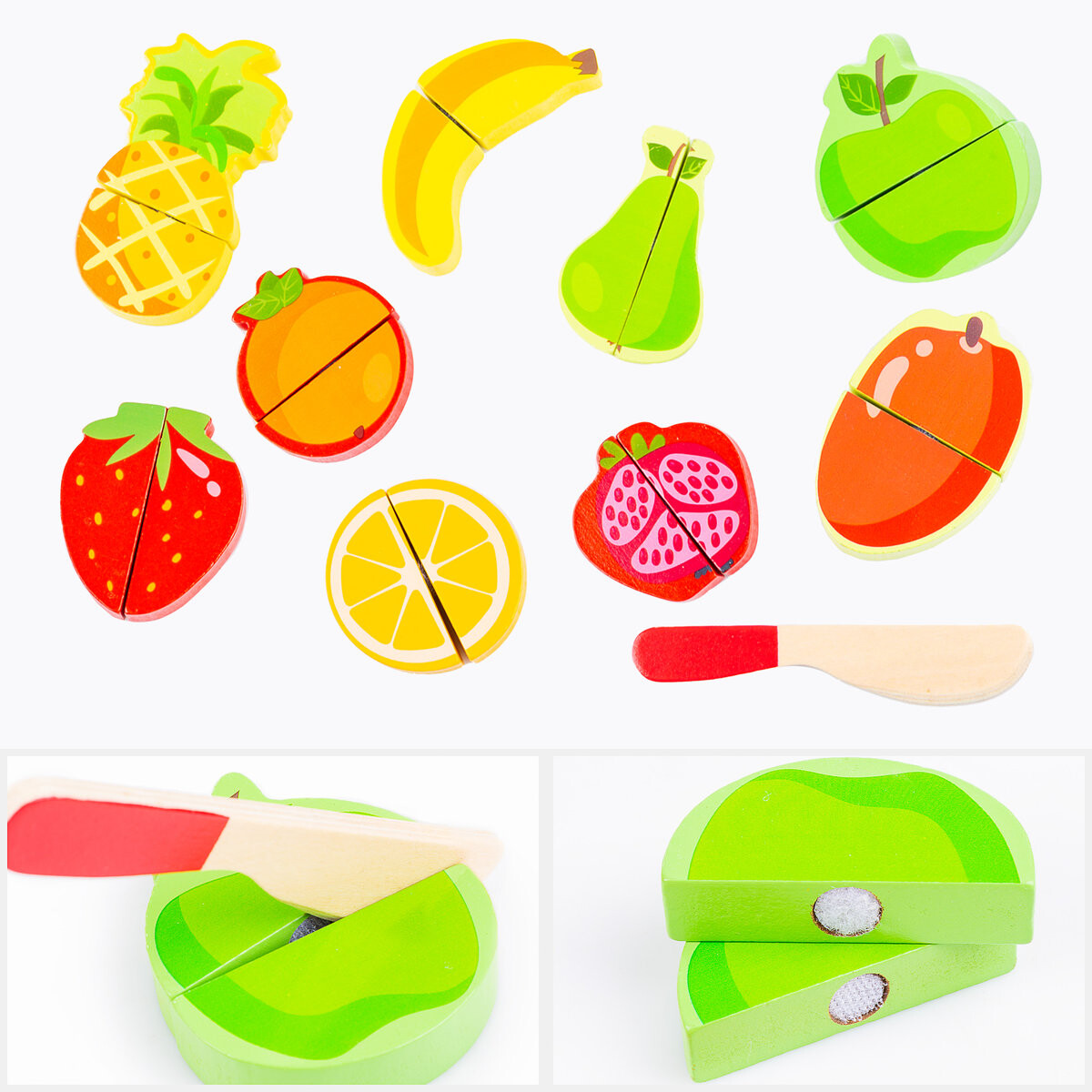 С помощью этой игрушки ваш ребенок выучит названия и узнавание популярных фруктов. . Все элементы набора изготовлены из дерева и покрыты безопасной для детей краской.