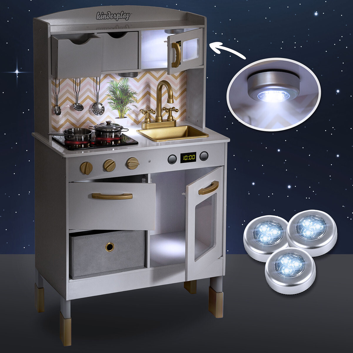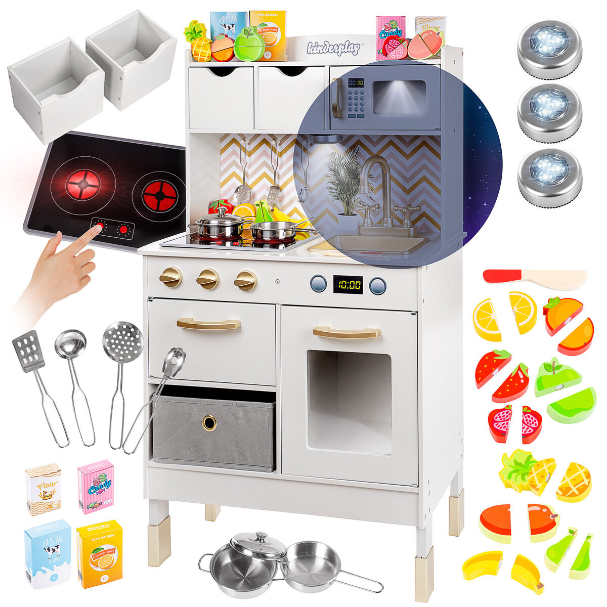 На кухне во время приготовления пищи издаются звуки. На конфорках загораются лампочки, благодаря чему веселье кажется еще более реалистичным.