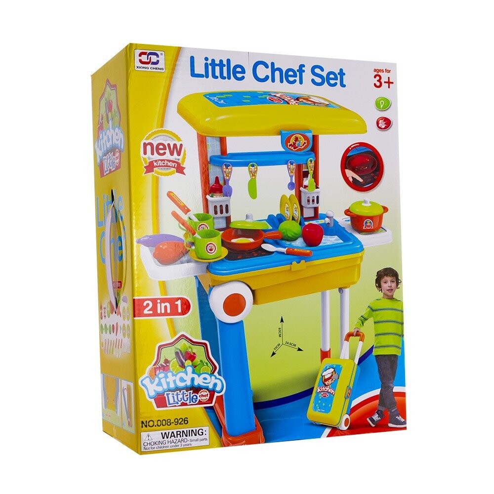 Кухонный стол-чемодан для самых юных поваров. Это подарит вашему ребенку много часов развлечений и разовьет зрительно-моторную координацию и абстрактное мышление. Это позволяет ребенку играть с родителем. Стол можно полностью упаковать в чемодан на колесиках. В комплект входит подсветка, издающая звук кипящей воды. Варочная панель имеет кнопки управления (вкл/выкл) и регулировку уровня приготовления.