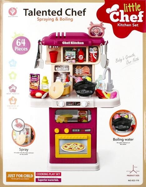 Вся вещь сделана из пластика и картона. На кухне есть звуковые и световые эффекты (варочная панель издает звуки готовки). Требуется 4 батарейки AALR06 (не входят в комплект).