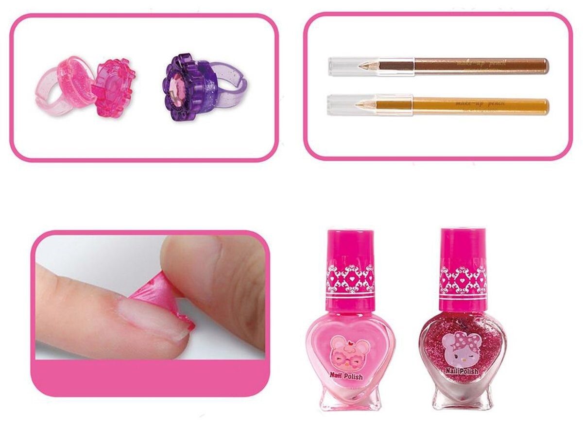 В коробке не только косметика для макияжа, но и косметика для укладки ногтей!Ребенок может взять чемодан куда захочет и организовать свой салон красоты, независимо от местонахождения.
