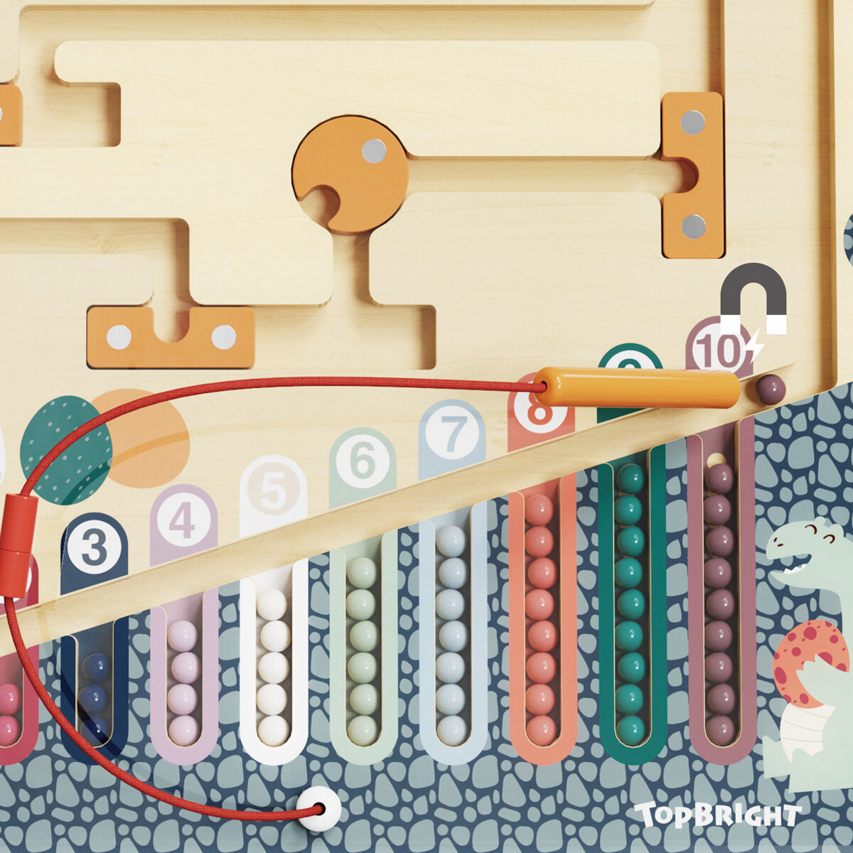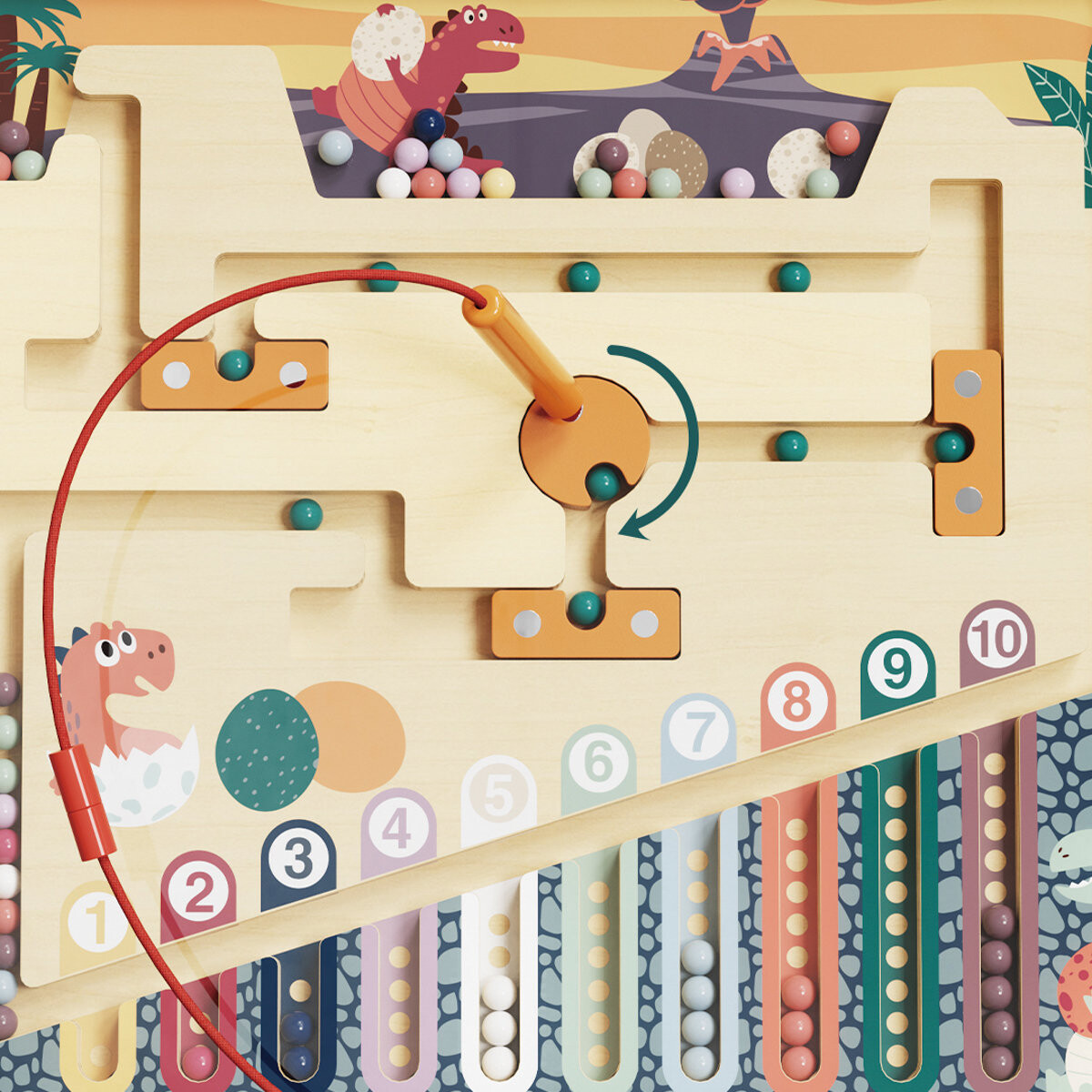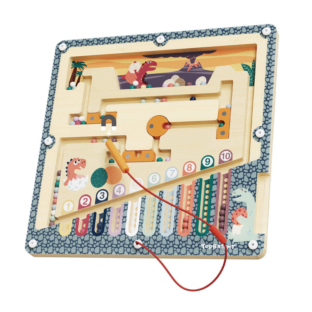 С помощью специального магнитного карандаша дети перемещают разноцветные яйца динозавров по лабиринту к гнездам. Дети не только учатся считать, но и тренируют координацию, концентрацию и логическое мышление, избегая препятствий в лабиринте.