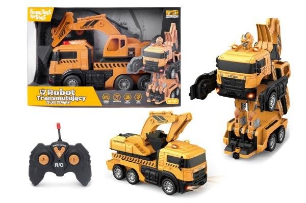Автомобиль (экскаватор) на дистанционном управлении, превращающийся в робота и генерирующий световые и звуковые эффекты. Игрушка выполнена в цвете дорожного автомобиля. Впечатление реалистичности усиливают графические мотивы и многочисленные тиснения. Изделие имеет подвижные элементы, которые увеличивают возможности игры.