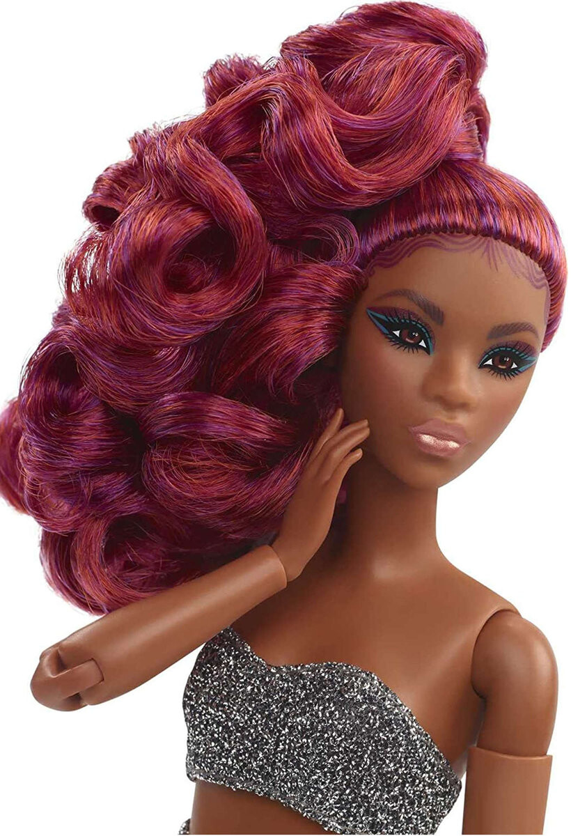У модели Барби №7 длинные красно-фиолетовые волосы и карие глаза. У нее много точек артикуляции, поэтому вы можете свободно ее позировать. В комплект входит подставка, на которой кукла может стоять. На ней короткий серебристый мерцающий топ и юбка, а также серебряные ботильоны. Игрушка изготовлена с исключительным вниманием к деталям, станет прекрасным элементом коллекции, а благодаря эстетичной упаковке прекрасно подойдет в качестве подарка.