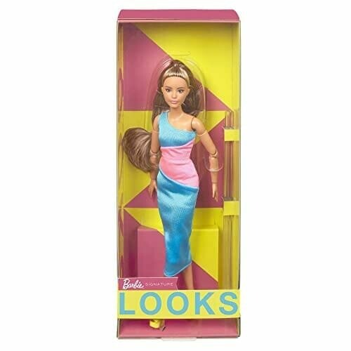 Эта уникальная кукла Barbie Looks HJW82 — идеальный подарок для каждой маленькой девочки. У куклы темные волосы, она одета в сине-розовое асимметричное платье миди на одно плечо. Это модное платье идеально подходит для укладки и позирования.