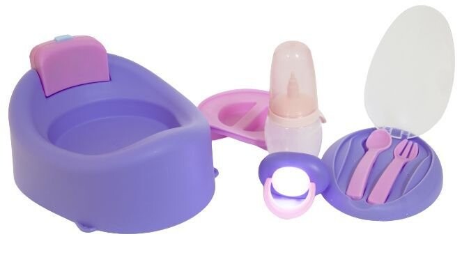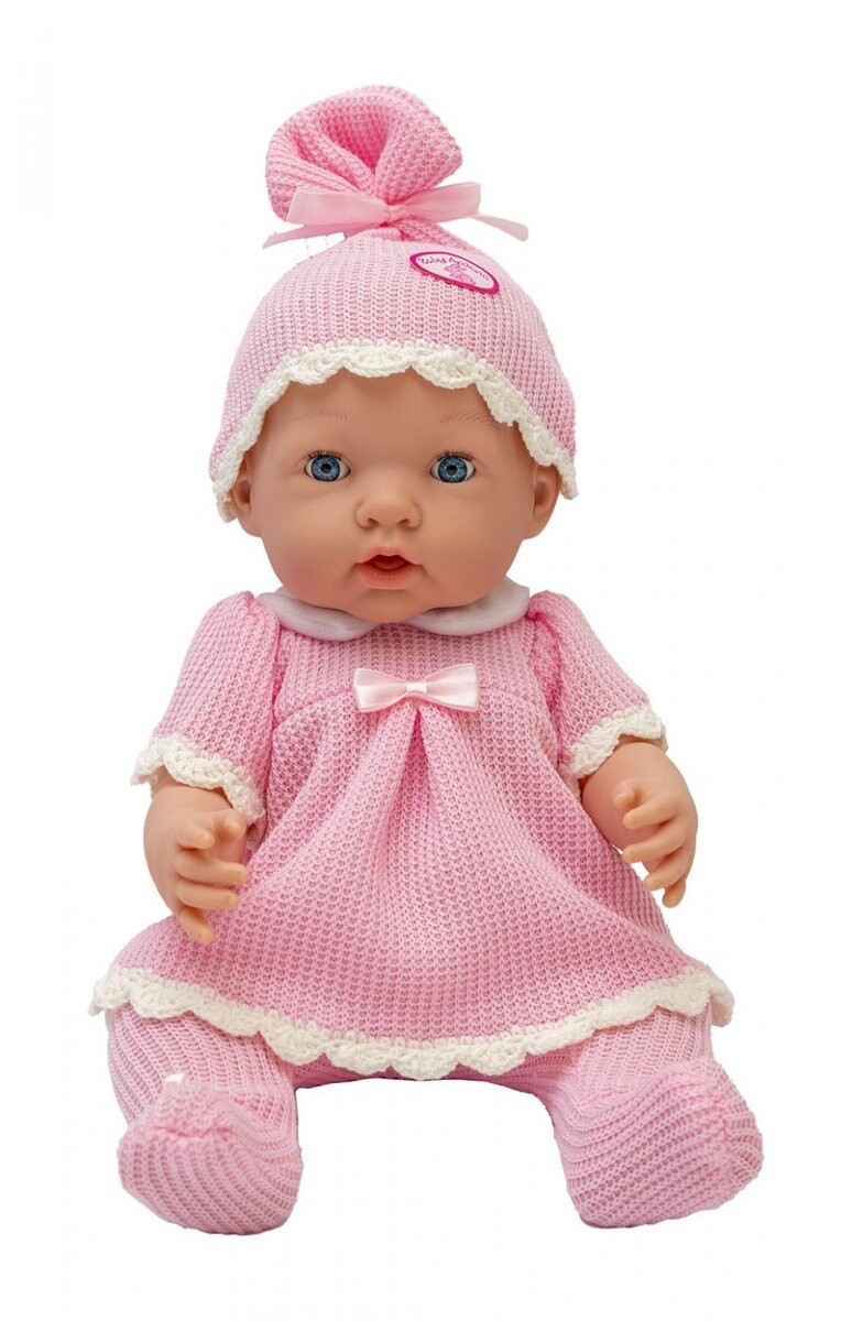 Очаровательная куколка, которая пьет из бутылочки и писает в горшок. В комплект входит кукла ростом около 40 см, одетая в вязаный наряд нежно-розового цвета и 5 аксессуаров: