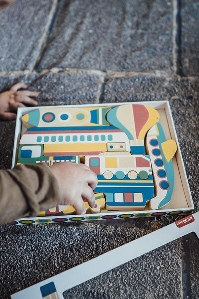 Деревянный пазл Vehicles from Auzou — это головоломка с красочными транспортными средствами, с которыми можно играть и собирать их вместе.
