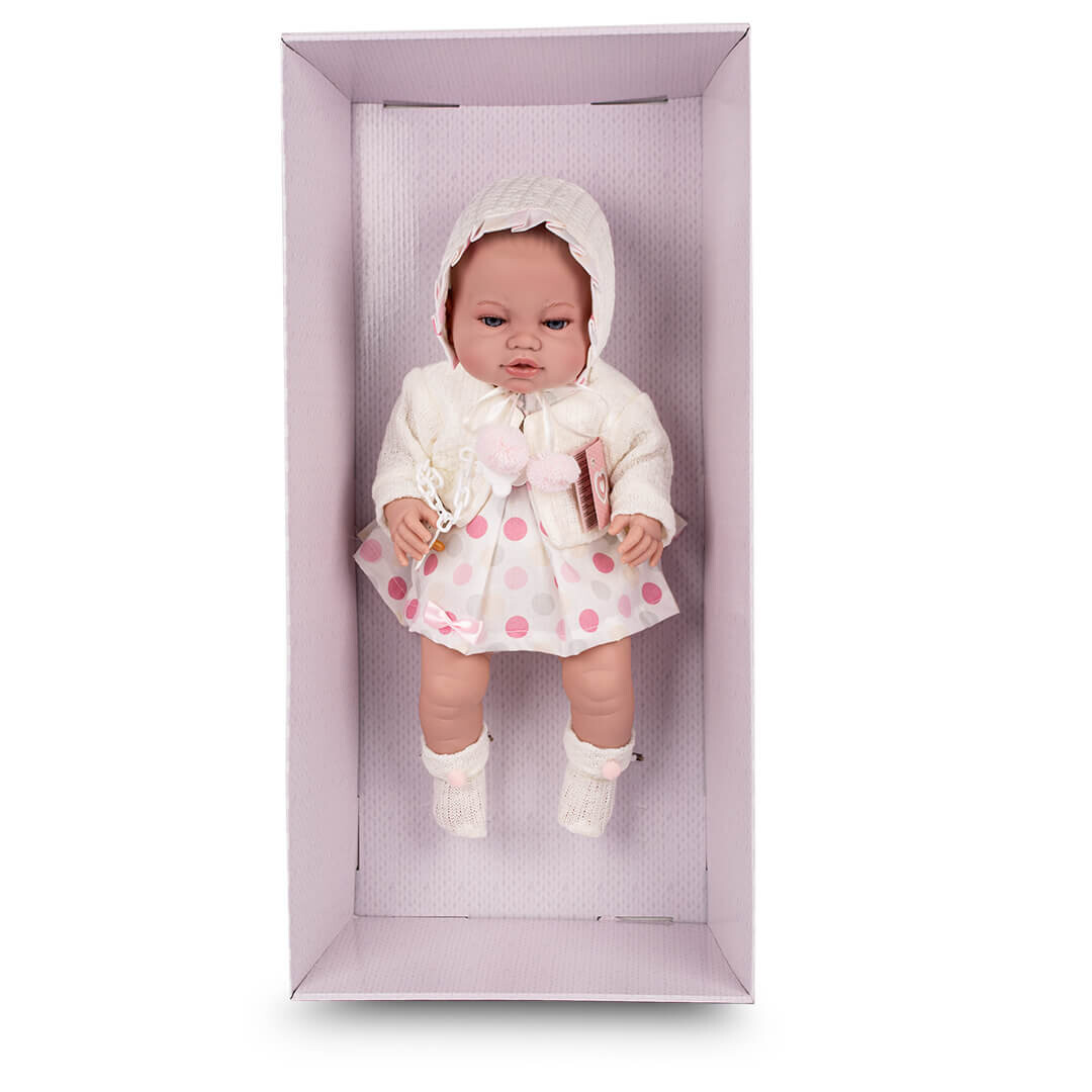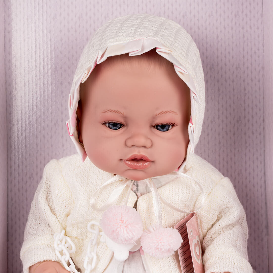 Оригинальная испанская кукла – идеальный выбор для каждой девочки, которая мечтает о красивой кукле, напоминающей настоящего младенца. Кукла изготовлена из мягкой резины, приятной на ощупь, что делает ее чрезвычайно реалистичной и детской. Одетая в элегантный белый наряд, включающий шляпу, свитер, платье и носки, кукла выглядит как живой новорожденный. Дополнительно в набор входит соска на цепочке, что делает его еще более очаровательным.Важнейшие особенности пупса: