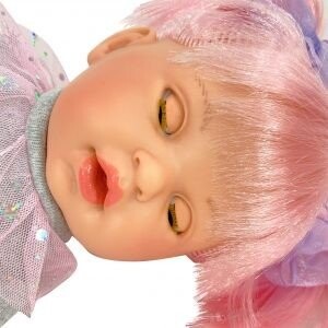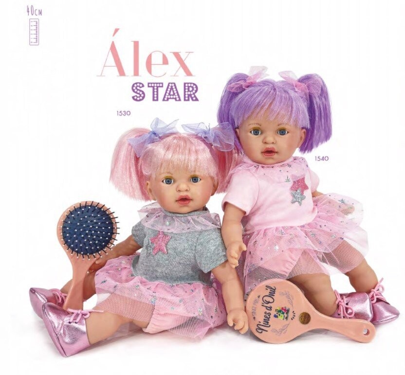 Кукла испанской компании Nines d'Onil Алекс Стар с розовыми волосами. Изготовлен из мягкого винила, имеет мягкий живот. В комплекте расческа. Одет в платье. Рост куклы 40 см.