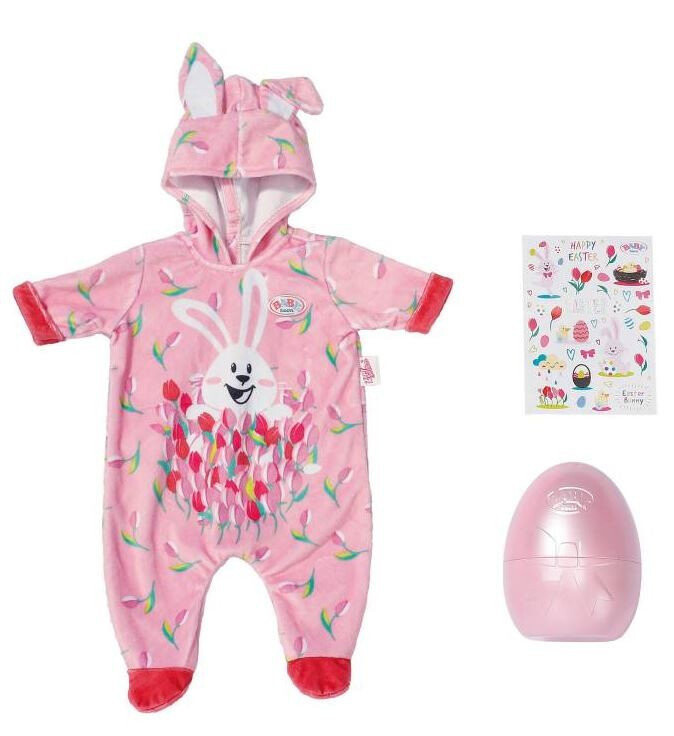 Всем, кто строит пасхальное гнездо, следует быть бдительными! В розовом пасхальном яйце BABYborn спрятана комбинезон. На комбинезоне изображен кролик Бенно и весенние тюльпаны. К капюшону пришиты забавные заячьи ушки. Красные ноги в сочетании с костюмом выглядят фантастически во время прыжков. Благодаря листу наклеек можно создавать пасхальные украшения.