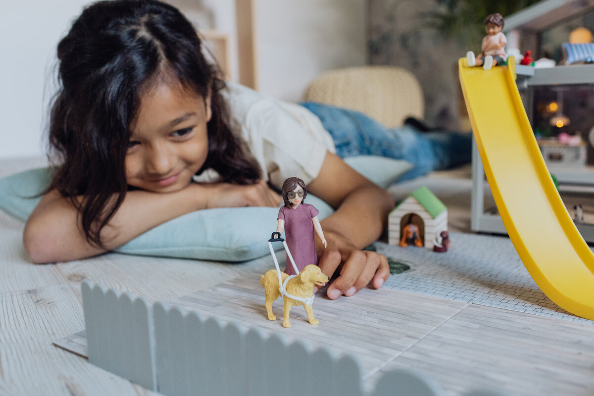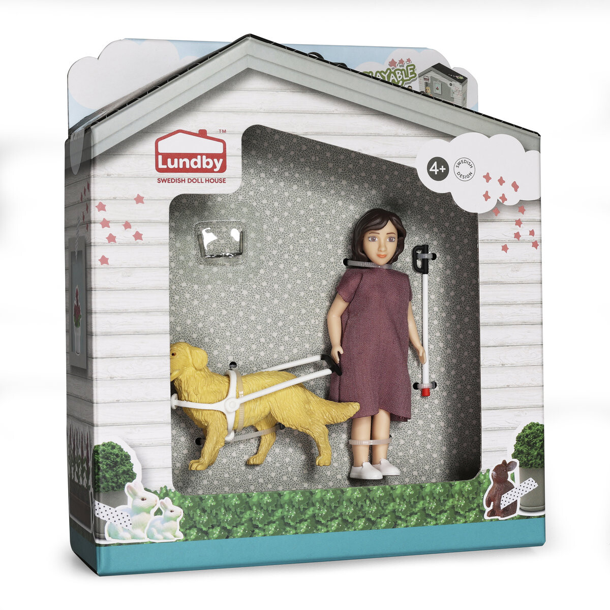 Набор с куклой от Lundby. Очаровательная кукла для кукольного домика с очками, тростью и собакой-поводырем в шлейке. Для облегчения игры можно прикрепить руки куклы к трости и шлейке.