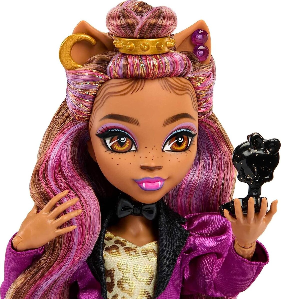 Кукла Клодин Вульф прибыла на Бал монстров в невероятно крутом стиле. Начинается вечеринка, которая наверняка станет хитом на жутких танцполах Школы Монстров. Этот невероятно элегантный наряд оборотня сияет ярко, как полная луна. Атласный материал имеет блестящую поверхность, а элегантные дужки придают дизайну драматичный характер. Клодин Вульф охотится за модой со своей сумочкой в форме полумесяца. Он открывается чтобы поместить внутрь ее компактный череп. Ее блестящие волосы подчеркнуты узлом с заклепками, а разноплановые серьги, черное колье с бантом от смокинга и туфли на платформе дополняют ее очарование. Дополнительные аксессуары для повествования сделают вечер жутковатым: групповое селфи на память о ночи, пугающий набор воздушных шаров, стена из пончиков и один пончик.