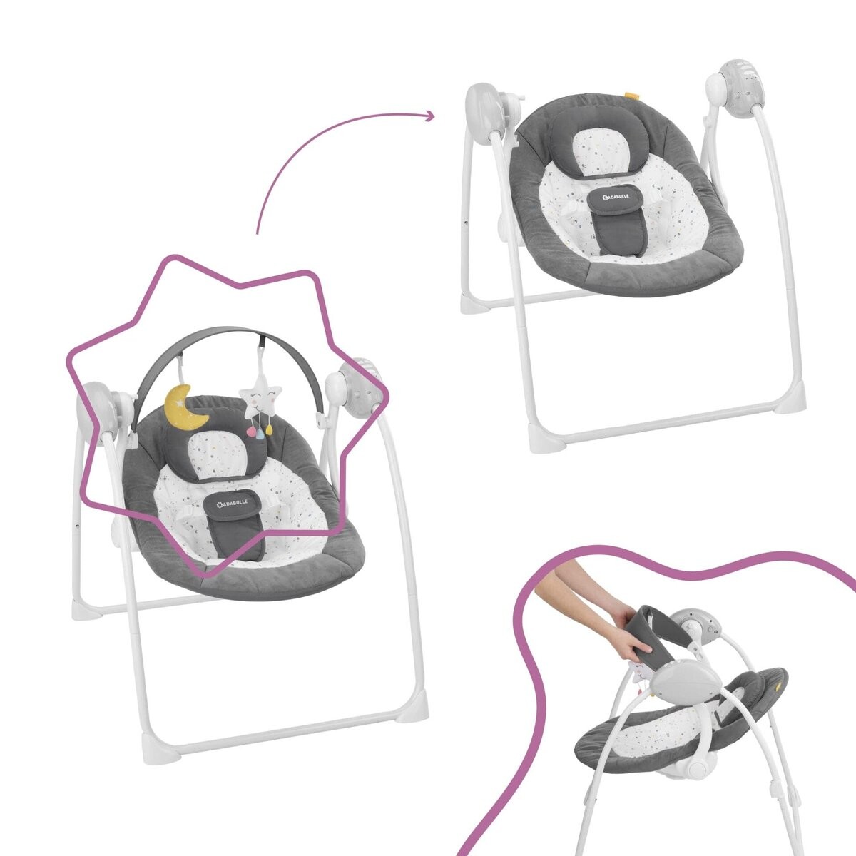 • МНОГОФУНКЦИОНАЛЬНОСТЬ: спинка и игровая планка наклоняются в нескольких положениях, а механизм качания имеет 5-ступенчатую регулировку скорости и автоматически отключается через 8, 15 или 30 минут по вашему желанию.