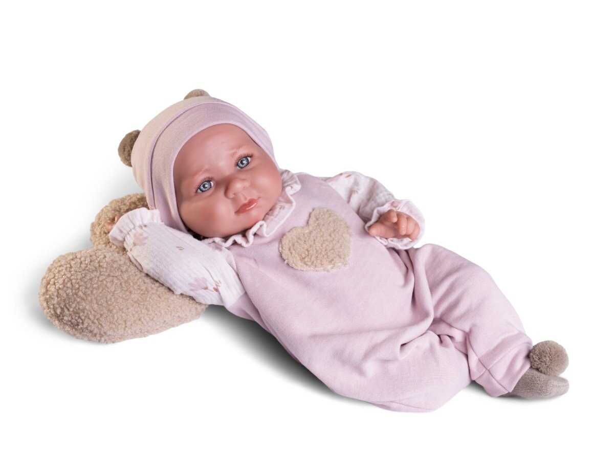 Испанская кукла Лука 33370 имеет качественную, стильную, сшитую вручную одежду и привлекательные аксессуары пудрово-розового и бежевого цвета:
