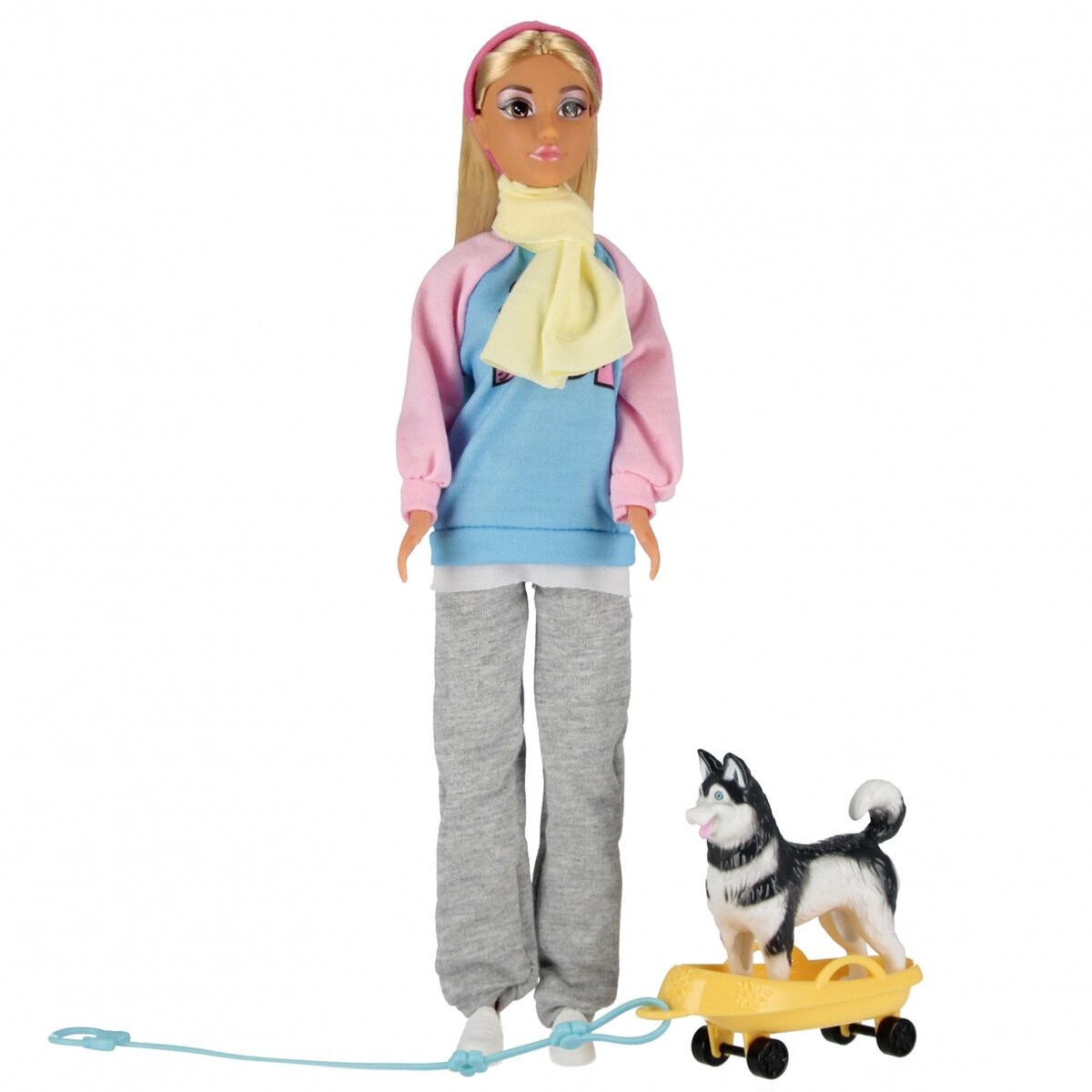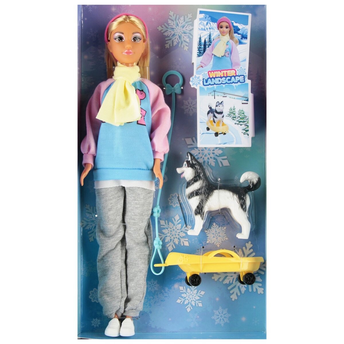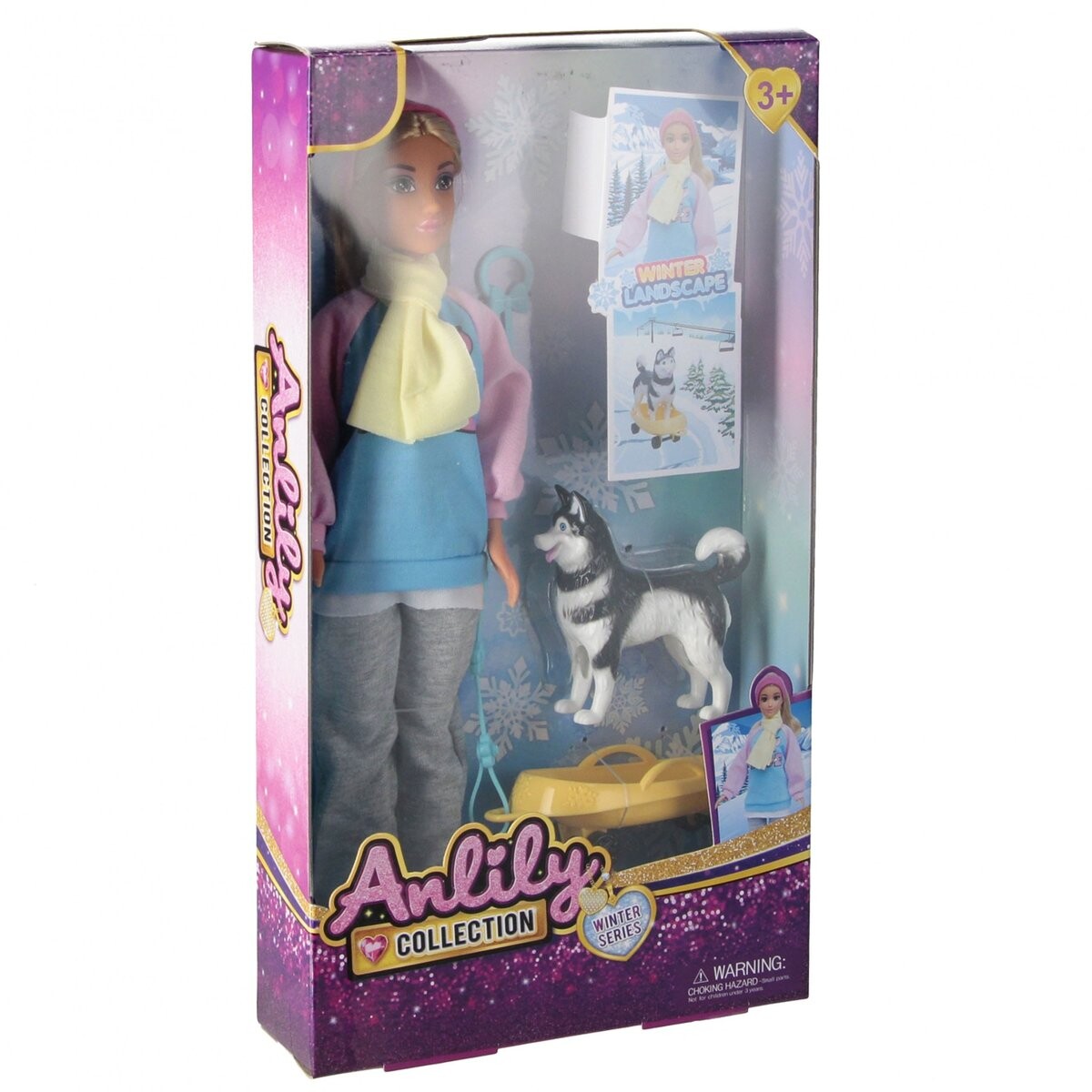 Состав набора:кукла в одежде, 1х фигурка собаки Хаски, 1х коляска для собачьей упряжки p>