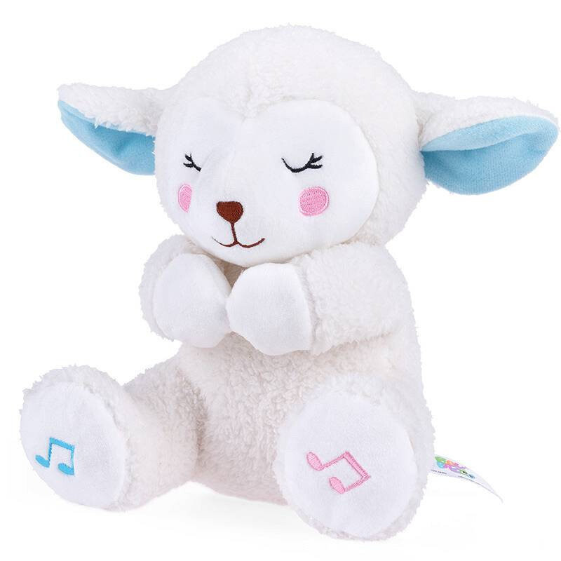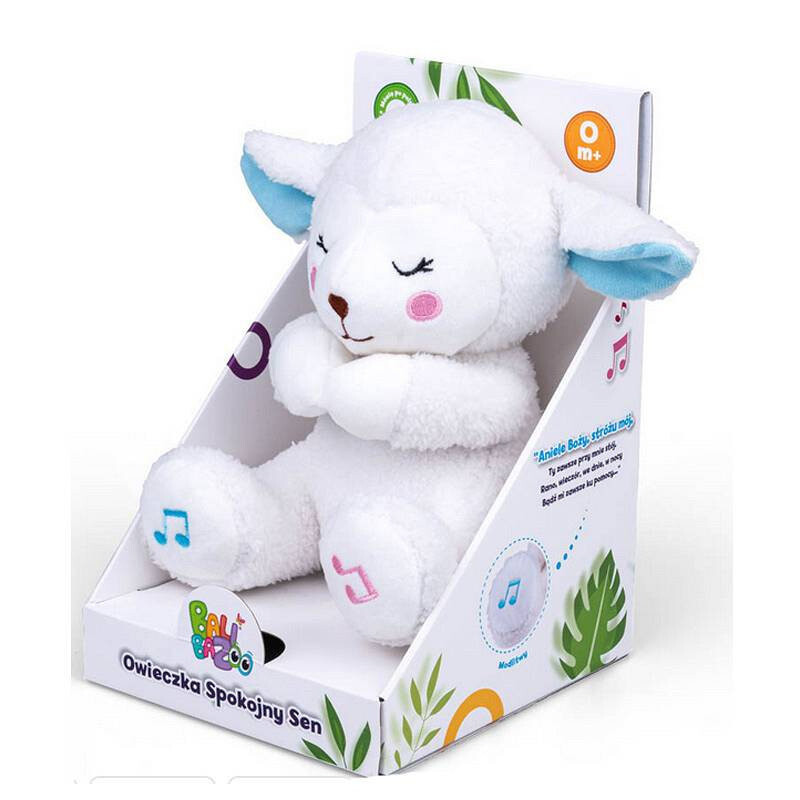 Эта милая овечка поможет малышам выучить первые молитвы «Отче наш» и «Ангел Божий», а когда придет время спать, будет играть приятные колыбельные. Отдельные звуки активируются нажатием на лапки плюша: молитвы – лапка с синей ноткой, колыбельные – лапка с розовой ноткой. Чтобы выключить звук, просто нажмите выбранную лапу еще раз. Овечка изготовлена из материалов различной текстуры, которые стимулируют осязание малыша, развивая его познавательные способности. Уши животного радостно шуршат при прикосновении.