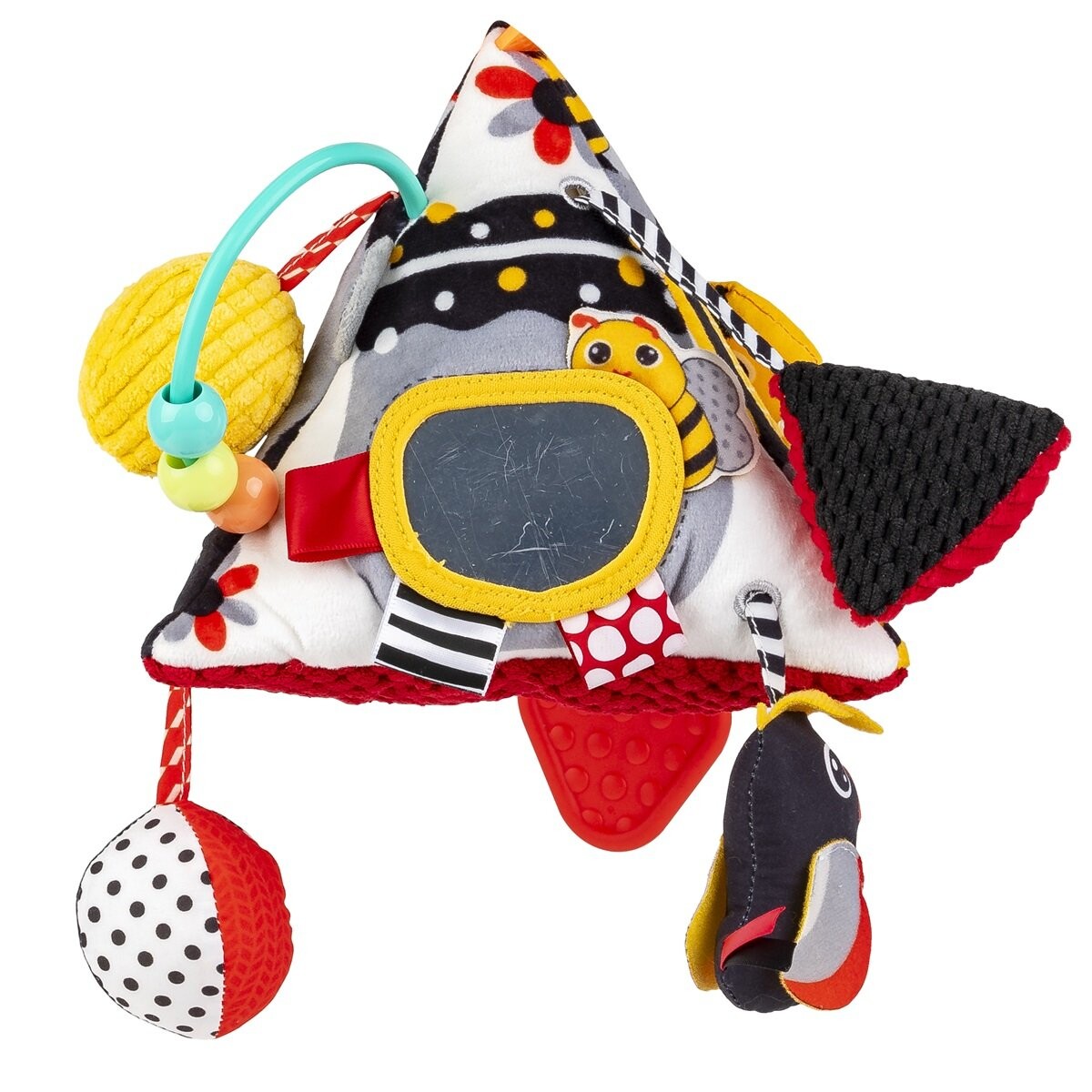 Многофункциональная игрушка, полная животных и сенсорных сюрпризов, доставит вашему малышу массу удовольствия! На каждой из мягких стенок пирамиды спрятаны разные сокровища, в том числе: пищалка, безопасное зеркало для самопознания ребенка, окруженное тканевыми бирками, и даже тянущие ленты, украшенные игрушками меньшего размера, в том числе пчелой, которую можно разместить в специальном кармане. Также имеется прорезыватель с выступами, который обязательно пригодится при прорезывании зубов и облегчит больные десны вашего малыша. Практичная ручка в виде повязки на голову с бусинами, которые можно перемещать пальцем, что облегчает подъем игрушки. Разнообразные материалы, из которых изготовлена пирамидка, будут стимулировать чувства ребенка. вдохновляя его исследовать мир сенсорными средствами.
