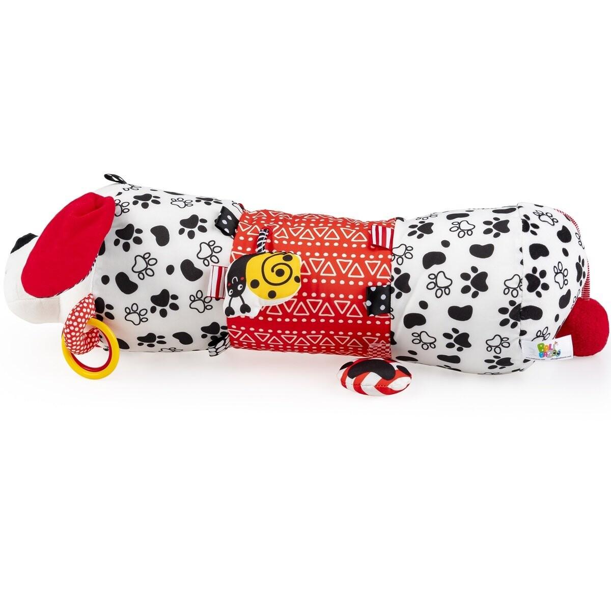 Здесь вы найдете погремушку, пищалку, красочные элементы, а также ленту для вытягивания, которая с одной стороны украшена тканевой улиткой, а с другой - мягким прорезывателем с выступами, которые принесут облегчение при прорезывании зубов. .