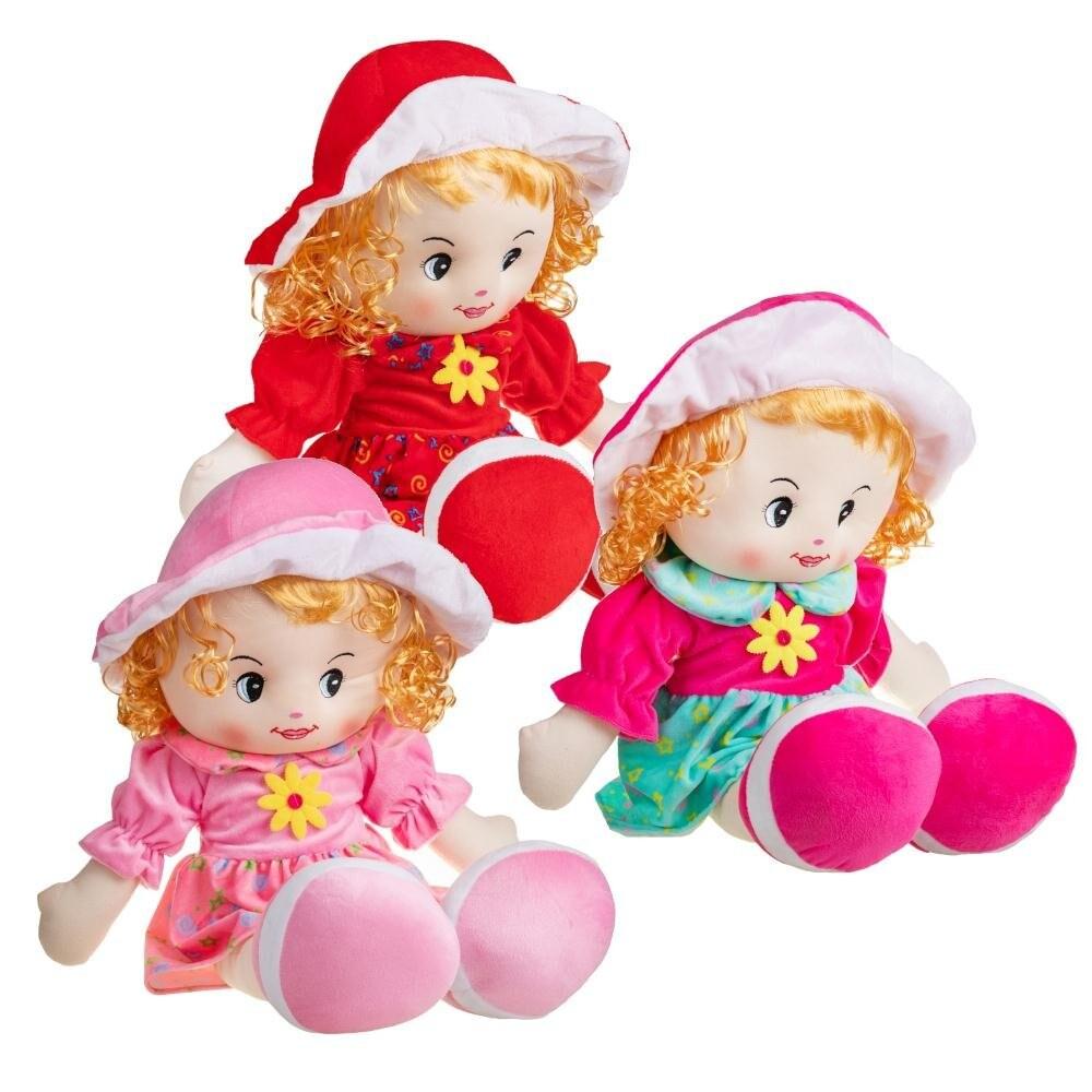 Куклы трех красивых цветов — отличная идея для подарка. У каждой куклы есть милая шляпка и платье с цветочной юбкой. Лицо куклы вышито и не содержит мелких деталей. Это идеальная игрушка с самого рождения. Идеально подходит для игр и обнимашек. Мягкая кукла – лучший друг каждой девочки!