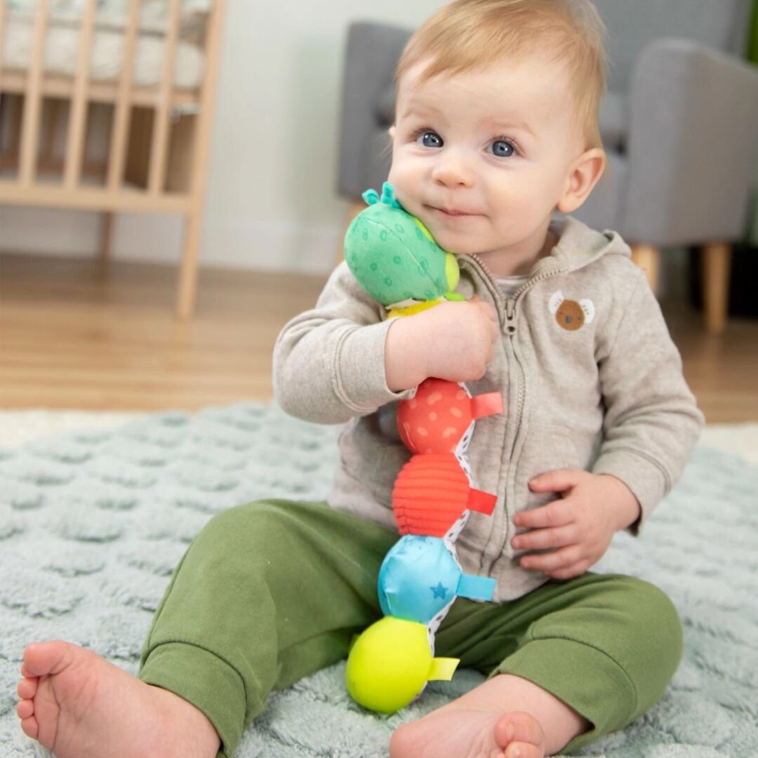 Представляем вам сенсорную новинку от Lamaze! Эта гибкая гусеница обязательно вызовет улыбку на лице вашего малыша! Он привлекает внимание своими цветами и шуршащими текстурами. Привлекает внимание ребенка благодаря контрастному черно-белому узору на животе и ярким цветам на спине. Самая интересная особенность — это поворотный сердечник, который позволяет малышам сгибаться и поворачиваться в любом направлении. Кроме того, в голове есть забавный колокольчик, который обеспечивает слуховую стимуляцию! Позвольте вашему малышу исследовать и развивать свой ум вместе с самой очаровательной гусеницей.