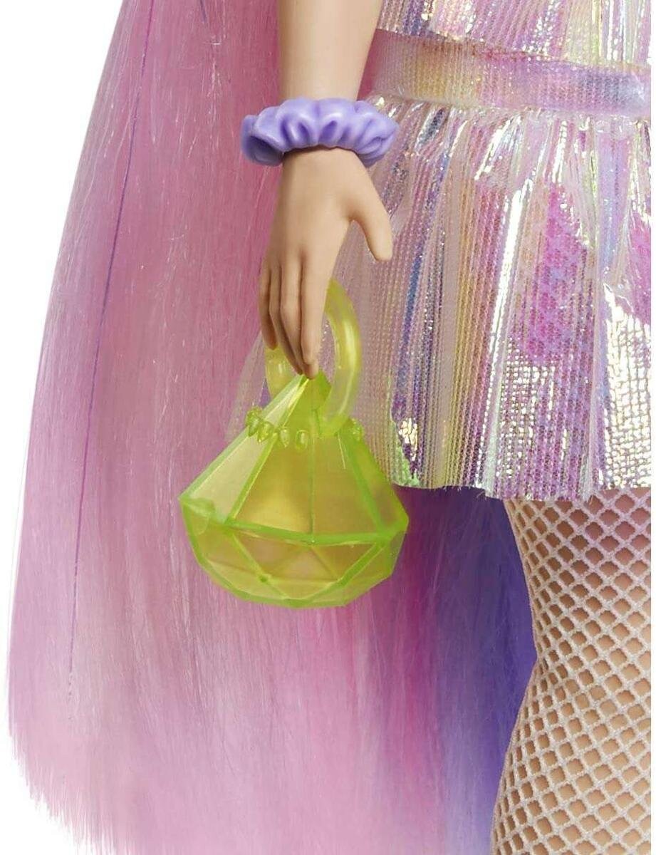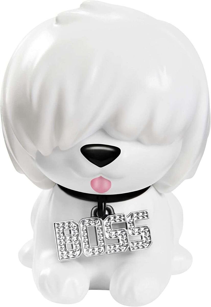 Кукла одета в белые чулки в сеточку, блестящую юбку и блузку с рисунком облаков, а дополняют ее оригинальные аксессуары, такие как сумочка в форме драгоценного камня и крупные серьги или цепочка. уникальный стиль. У Барби мерцающие волосырозового и фиолетового цвета, а их длина составляет целых 21 см! В комплект с куклой также входит белая собака. чьи глаза закрыты гривой. На щенке ошейник с надписью «Босс». Всего в комплект входит 15 аксессуаров.