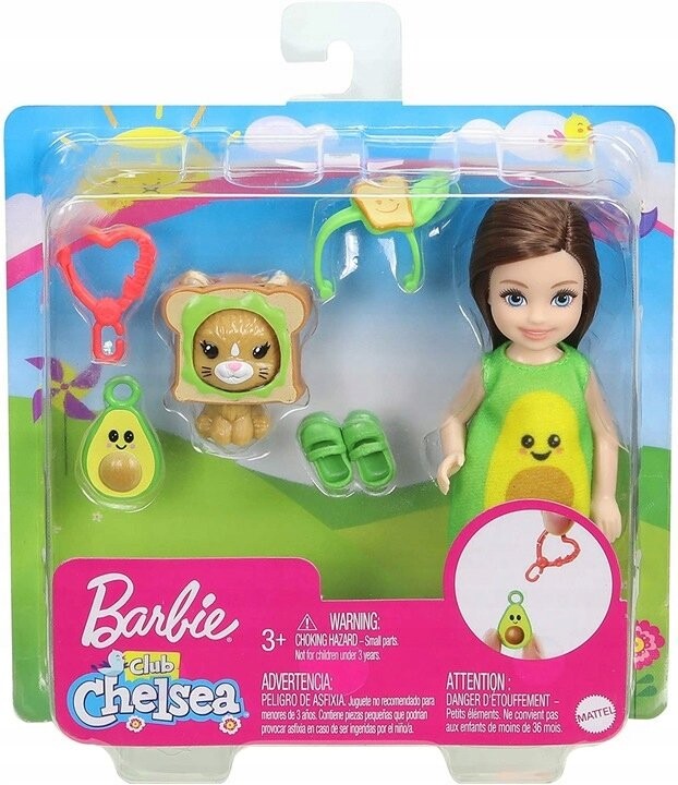 Эта кукла Челси носит костюм авокадо. со смайликом и кулоном в форме сердечка. Очаровательная повязка на голову из авокадо и зеленые туфли завершают очаровательный образ, а котенок в соответствующем костюме в качестве компаньона доставляет еще больше удовольствия.