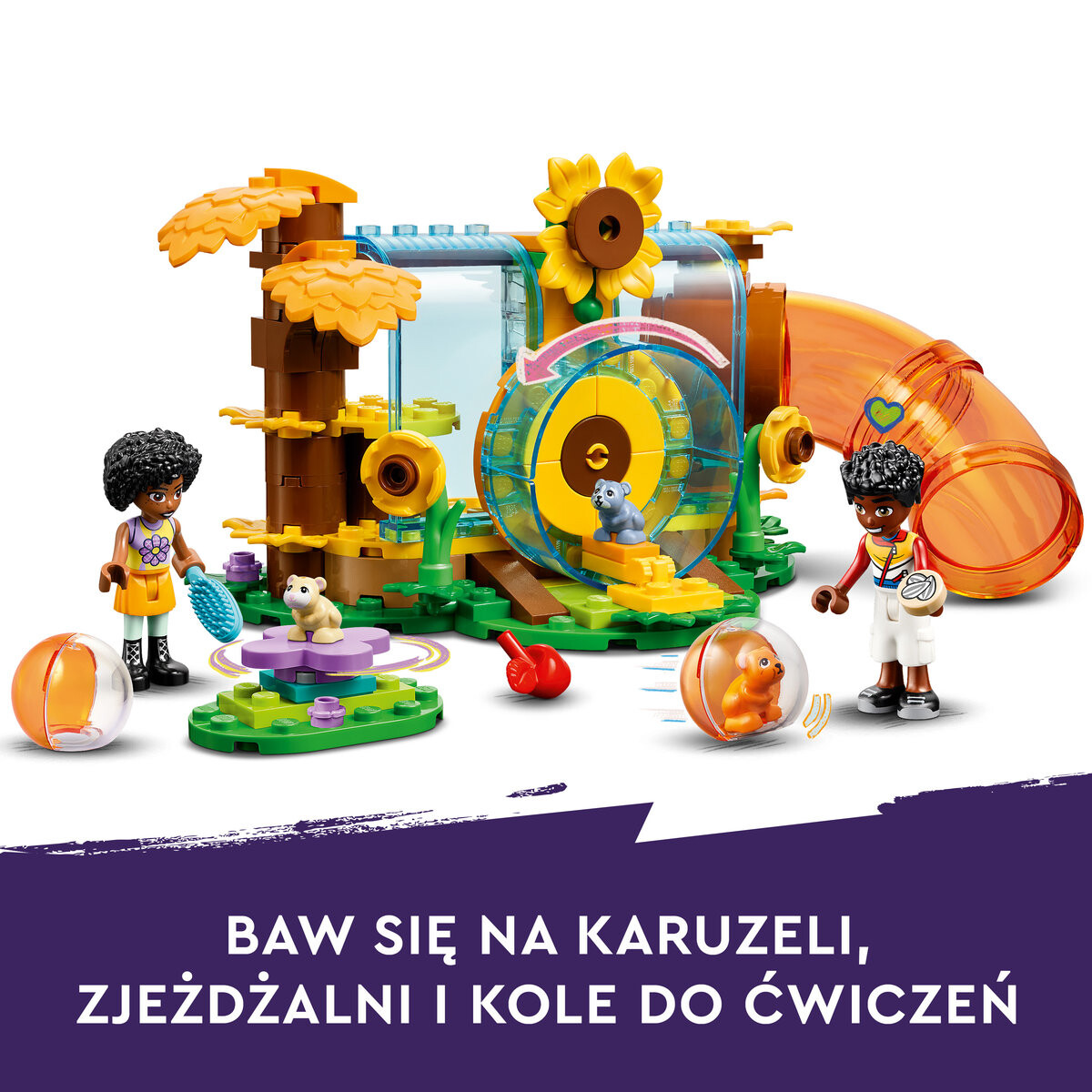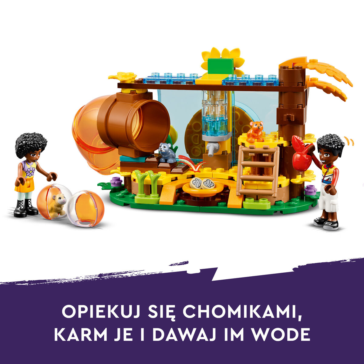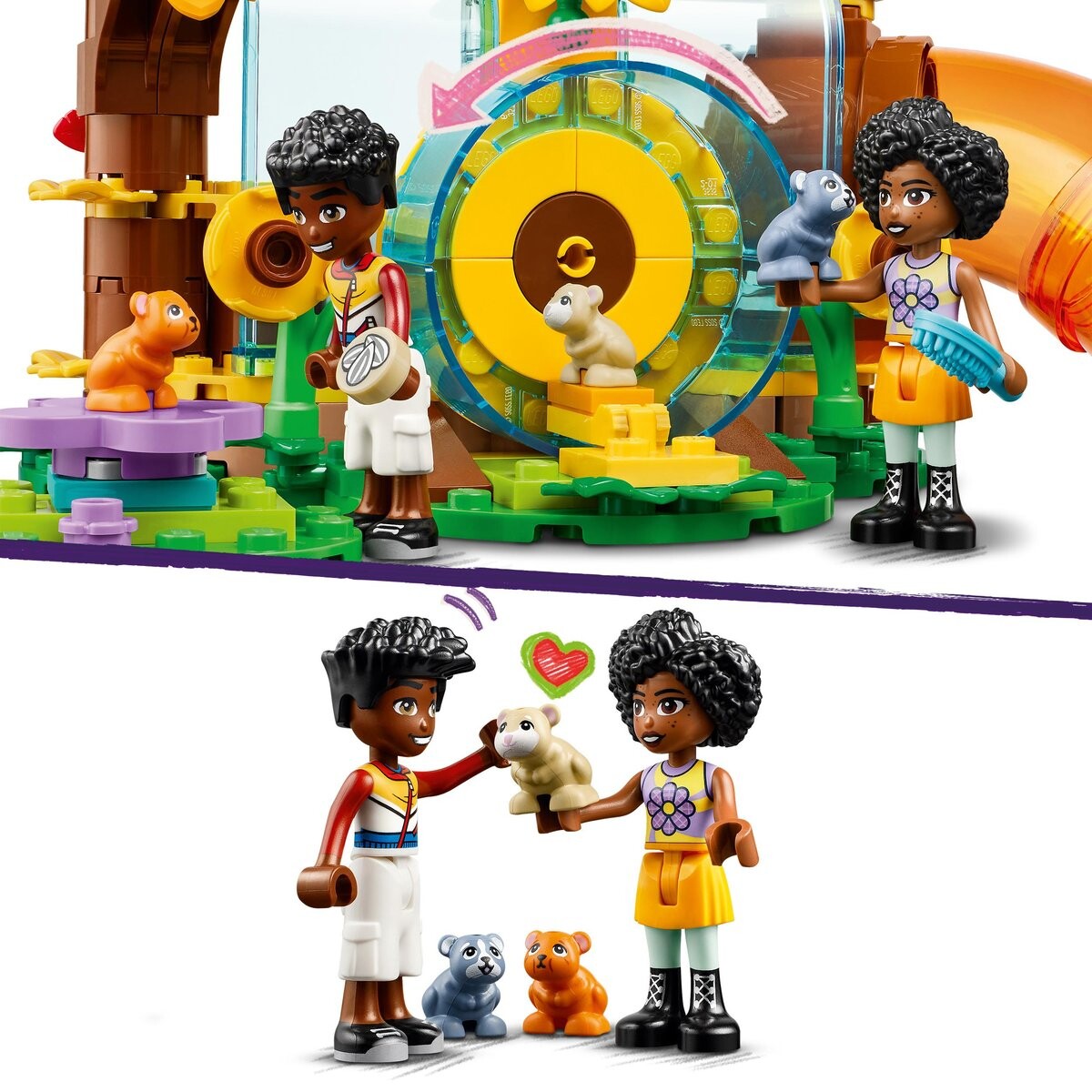 Игровая площадка для хомяков LEGO FriendsДве мини-куклы и три хомякаВ набор входят Зак и Джамиля, а также хомячки Смешек, Бин и Грыжек.