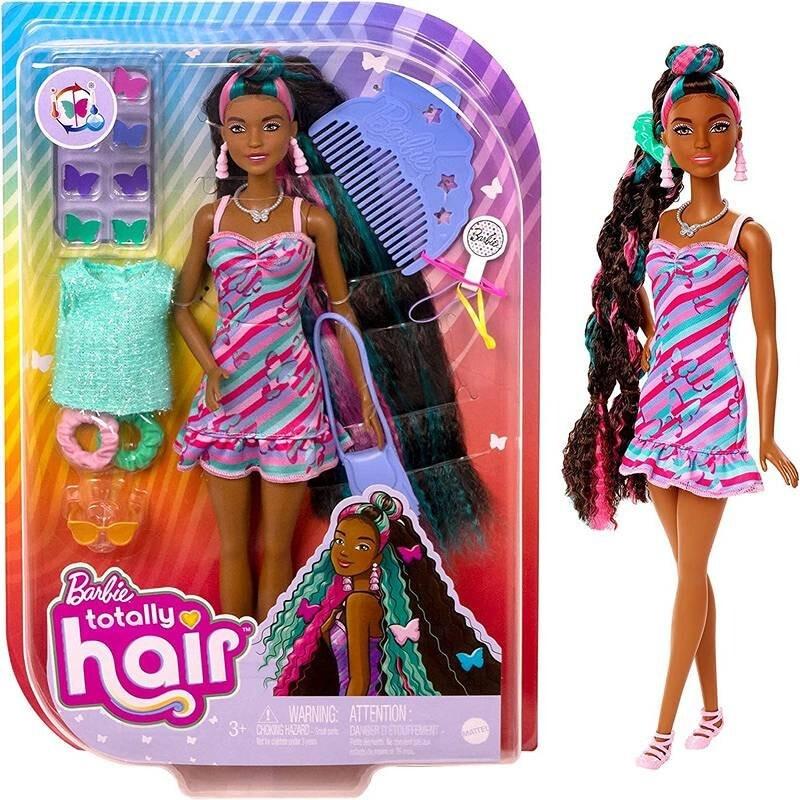 Barbie Totally HairВдохновленная чрезвычайно популярной куклой Barbie 30-летней давности, кукла Barbie Totally Hair в стиле бабочки имеет свой собственный уникальный стиль и прическу. У куклы очень длинные волосы (21,5 см), которые можно укладывать по своему усмотрению. Содержимое набораВ наборе более 15 дополнительных элементов, в том числе 8 заколок, меняющих цвет, аксессуары и дополнительный наряд. У куклы Барби стандартной посадки завитые волосы, частично собранные в пучок, имеют розовые и бирюзовые блики. На ней стильное приталенное платье с принтом бабочки. Детям понравится создавать разные прически и иметь безграничные возможности для укладки! Кукла не стоит сама по себе. Цвета и декоративные элементы могут различаться. Для детей от 3 лет. Особенности куклыВ комплект входит более 15 дополнительных элементов, в том числе 8 заколок, меняющих цвет. аксессуары и дополнительная одежда. У куклы Барби стандартной посадки завитые волосы, частично собранные в пучок, имеют розовые и бирюзовые блики. На ней стильное приталенное платье с принтом бабочки. Детям понравится создавать разные прически и иметь безграничные возможности для укладки! Кукла не стоит сама по себе. Цвета и декоративные элементы могут различаться. Для детей от 3 лет. Создайте прическу своей мечтыКукла Barbie стандартной посадки украшена мотивом бабочки и розовыми и бирюзовыми бликами в завитых волосах, частично собранных в пучок. На ней простое приталенное платье с принтом бабочки. Детям понравится создавать разные прически и иметь безграничные возможности для укладки. Это идеальный подарок для детей от 3 лет, особенно для тех, кто любит открывать для себя разные стили и создавать прически и наряды.