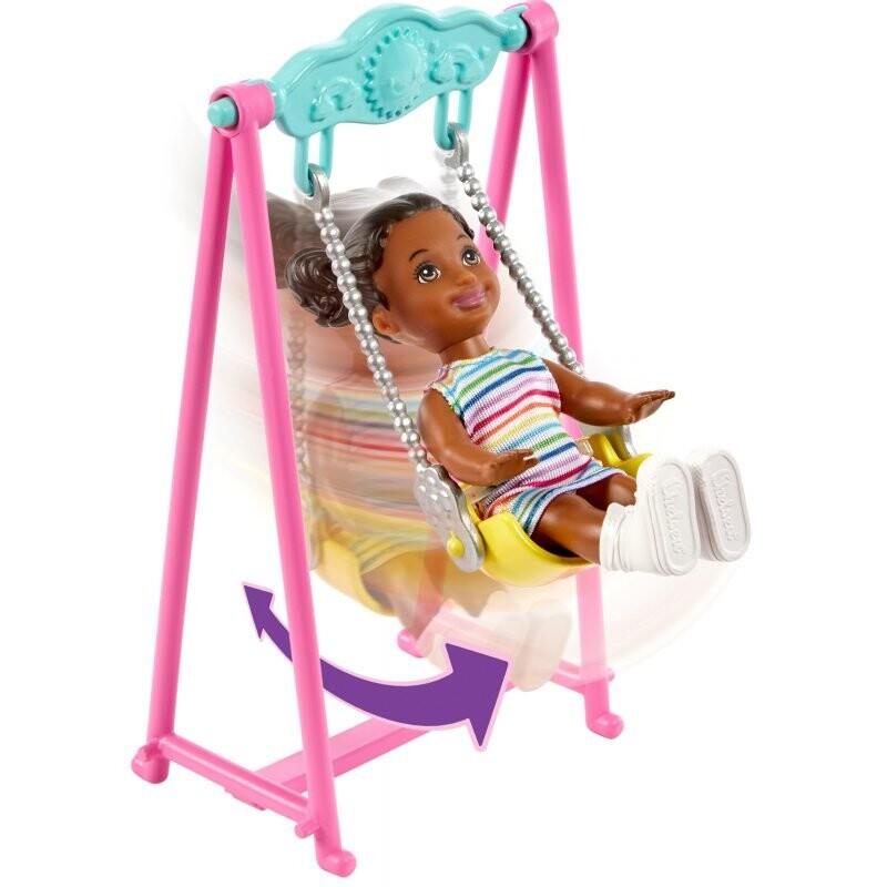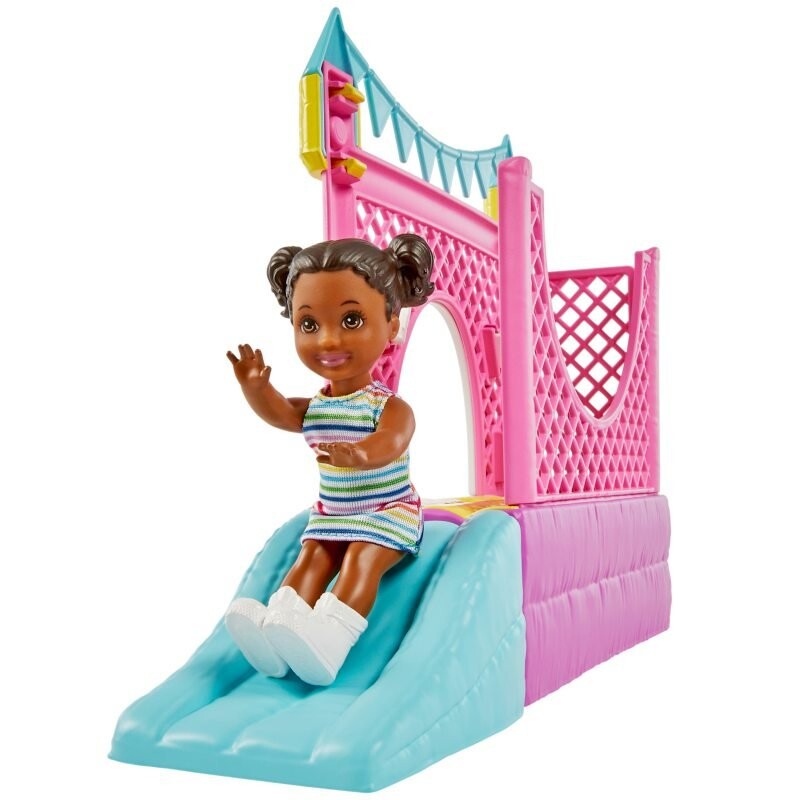 Набор — Кукла Барби-няня Шкипер надувной замок. Набор позволит вам поиграть в парке развлечений. В упаковке две куклы, одетые в праздничные наряды (одна маленькая, другая большая). Еще есть замок, напоминающий надувную горку с работающим батутом. В его конструкции не было упущено деталей (наверху разместились башенки и вымпелы). В число доступных аксессуаров, которые разнообразят наше веселье, входят: качели, аттракцион, игровая площадка в форме сердца и плюшевый мишка.