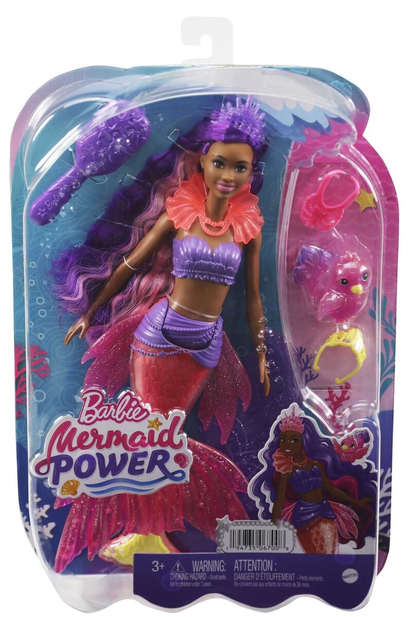 Погрузитесь в мир приключений с куклой Barbie «Brooklyn» Roberts, вдохновленной сказкой «Barbie MermaIndonesia Power Mermaid Power»! Кукла Барби «Бруклин» Робертс в образе русалки выглядит точно так же, как в фильме: у нее красивые, очень длинные волосы, чудесный хвост русалки с эффектом омбре и сказочными деталями. В комплект куклы также входят два сменных плавника, два ожерелья, две диадемы и расческа, так что дети смогут создавать потрясающие прически для любого приключения! Куклы Barbie MermaIndonezja Power Сила русалок для детей от 3 лет вдохновляют их воссоздавать любимые моменты из фильмов или создавать свои собственные истории. Продается отдельно в зависимости от наличия. Куклы не стоят и не плавают самостоятельно. Цвета и декоративные элементы могут различаться. ​
