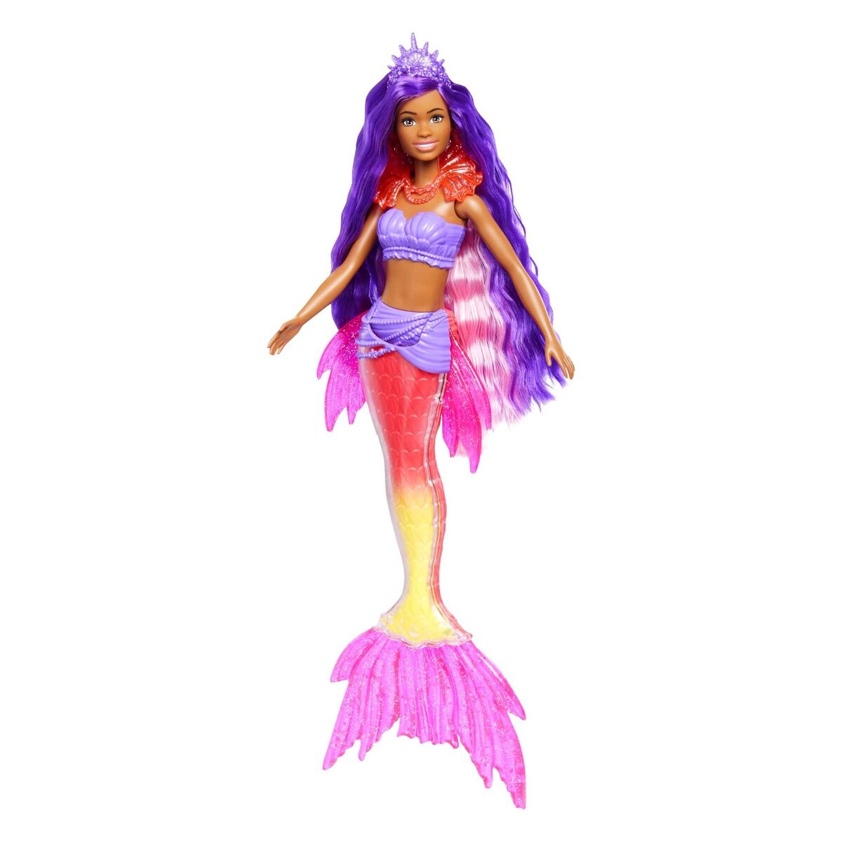· Волшебный внешний вид куклы-русалки Барби включает в себя очень длинные фиолетовые волосы и красивый хвост с эффектом омбре, чудесные акценты и чешуйки.